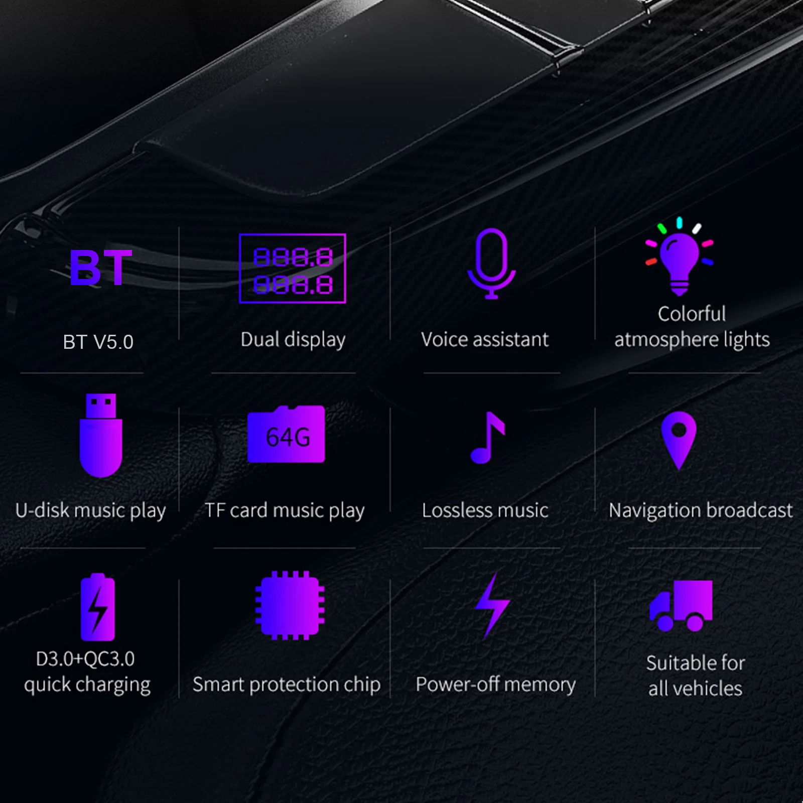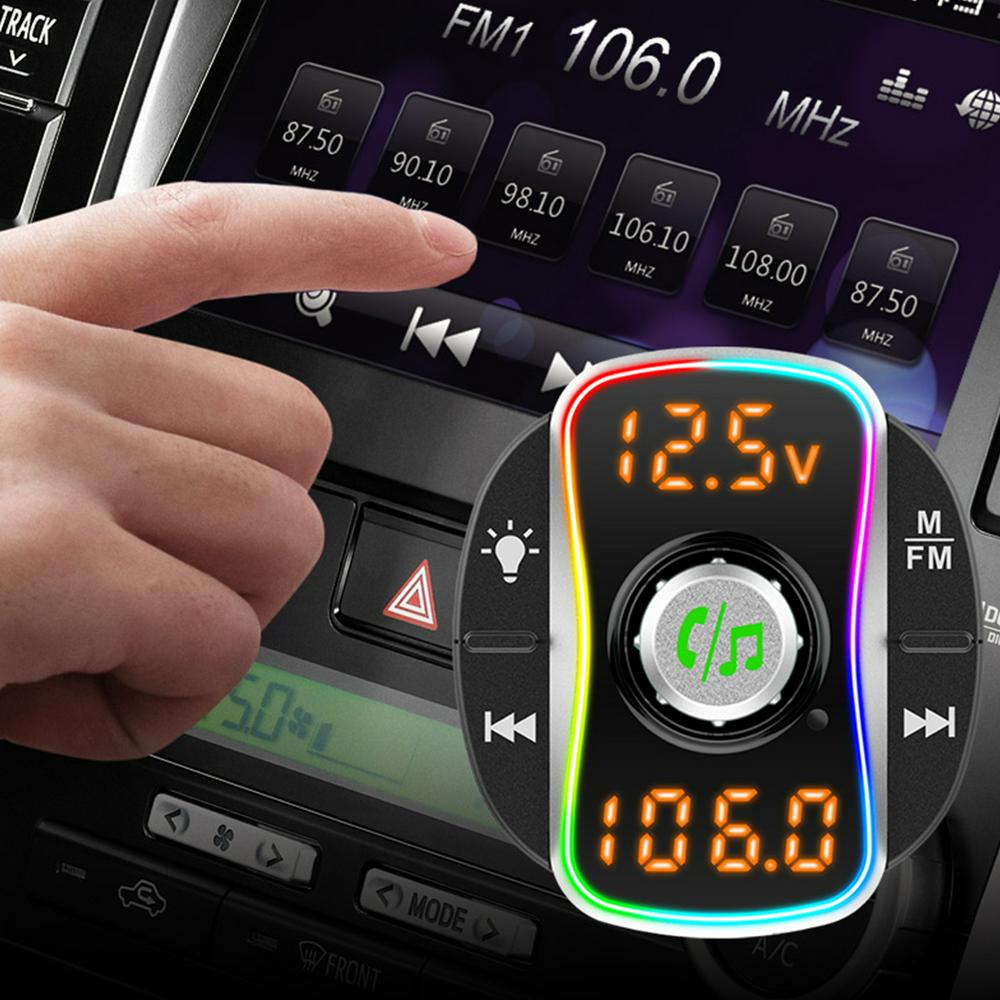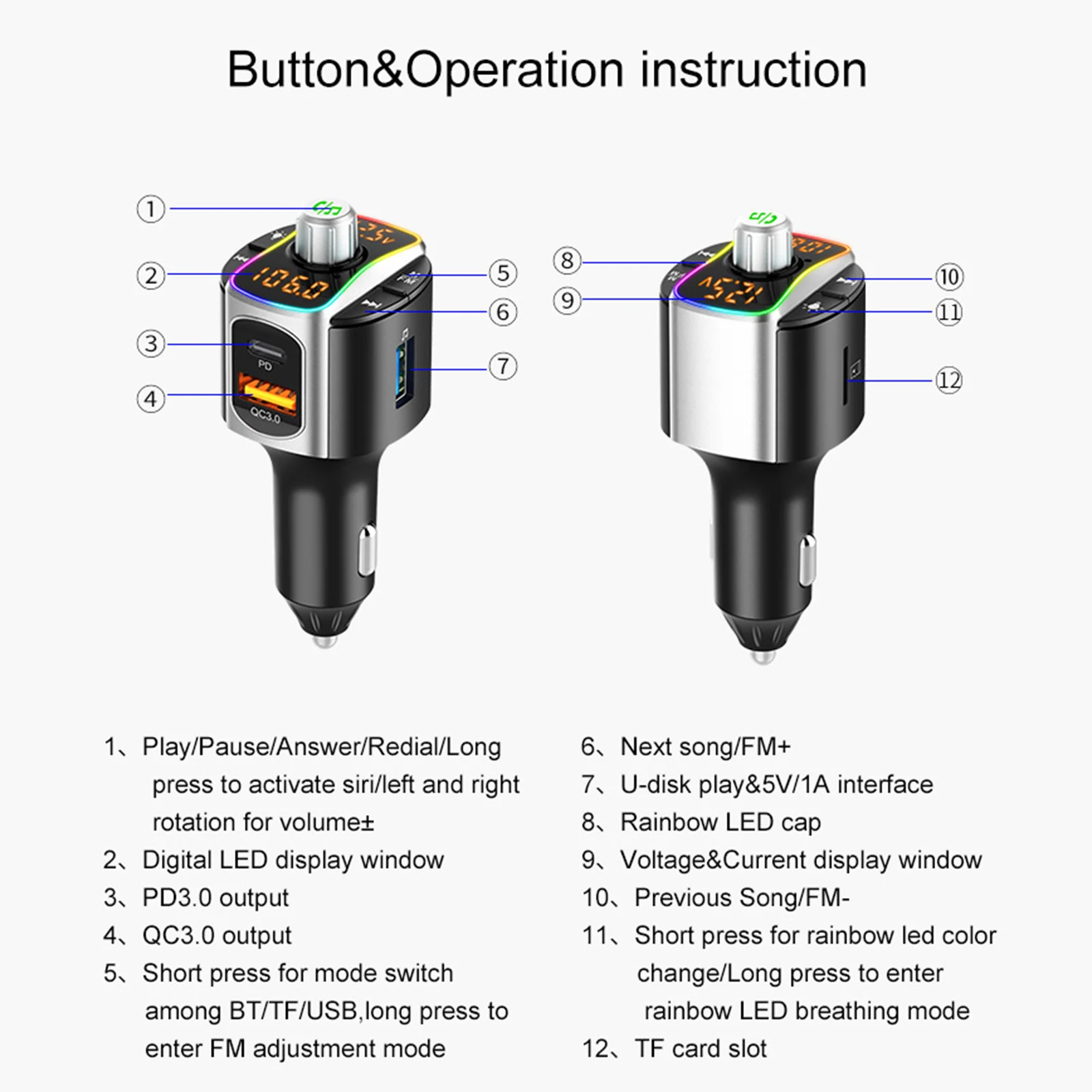 Plug the device into the cigarette lighter of your car directly. Supports dual digital display, 7 colors LED breathing lights. Support battery voltage detection. Supports activating voice assistant.