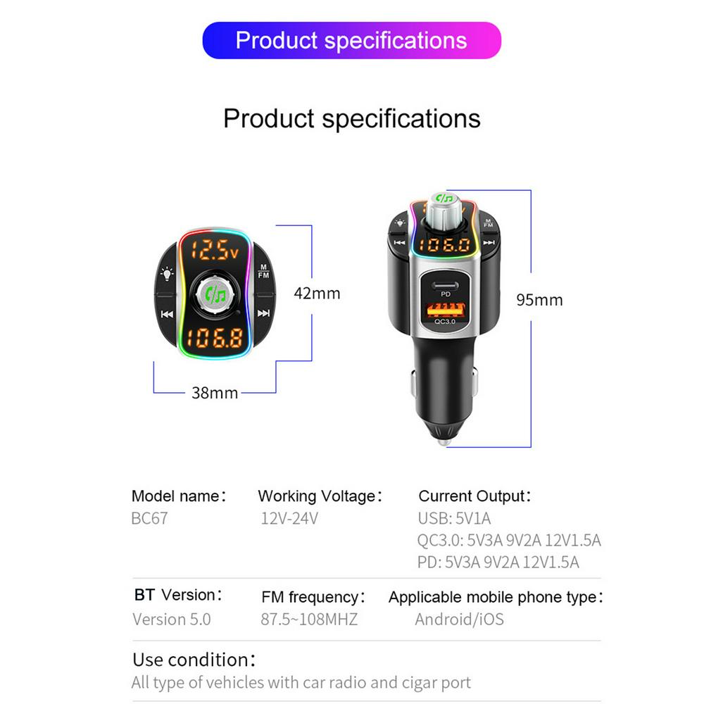 BC67 is a Hands-free BT Car Kit with dual charging ports supporting QC3.0/PD3.0 fast charging. It can decode music files downloaded to USB Disk or TF Card, then transmit to your car stereo through FM transmission; and can also enjoy wireless music via BT connection. With this product, you can also answer and end hands-free calls with a built-in microphone.