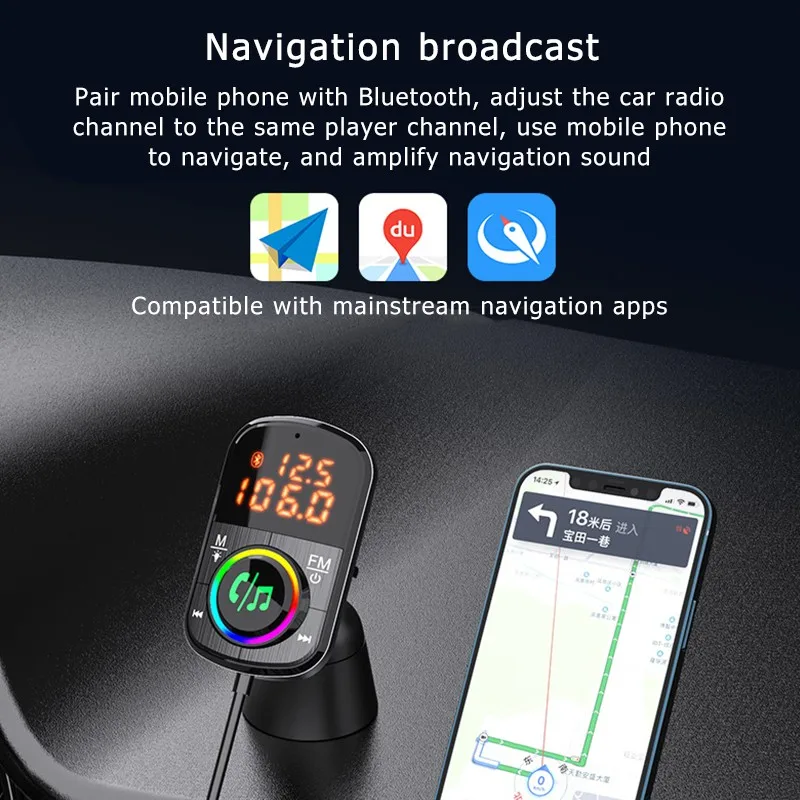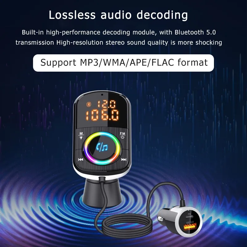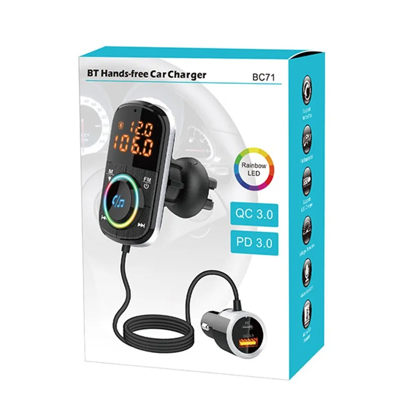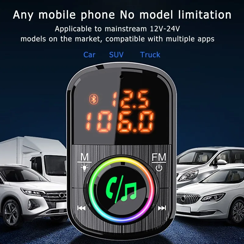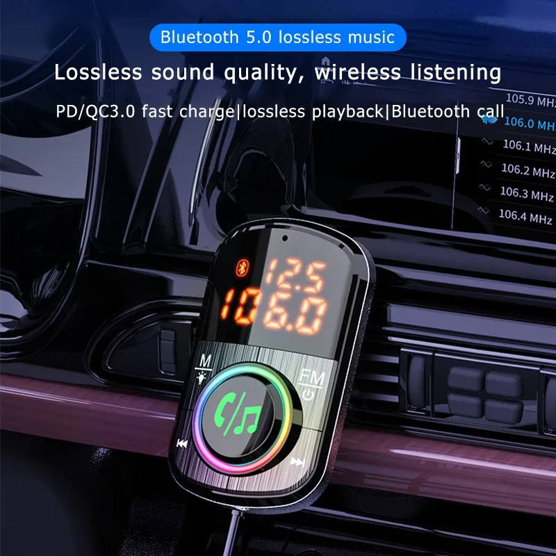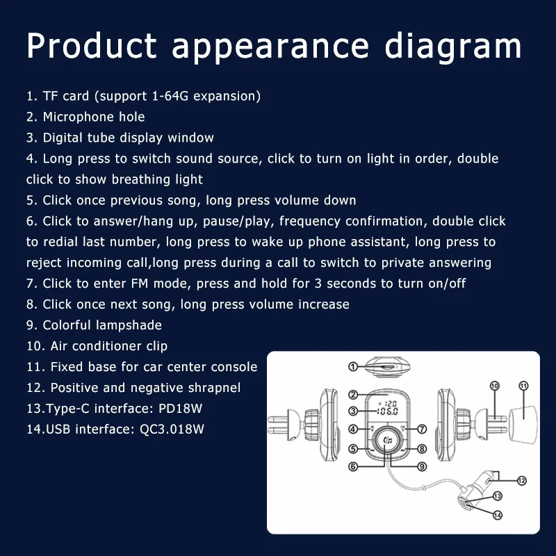 Rated working voltage: 12V-24V Limit working voltage: 10~26V USB1: QC3.0 (maximum 18W) Type-C: PD3.0 (Max 18W) Working temperature: 0~50℃ Support playback format: MP3 / WMA / WAV / FLAC S/N ratio>60dB Battery voltage error: ±0.5V Bluetooth version: Version 5.0 Bluetooth sound processing: support DSP, A2DP Bluetooth transmission distance: 10M Bluetooth microphone effective distance: 0.5~2M FM transmitting frequency: 87.5~108Mhz Features: 1. Bluetooth version Bluetooth V5.0 2. Support dual display digital tube, real-time detection and display of battery voltage 3. Support orange USB port (QC18W), Type-C port (PD18W) 4. Support colorful atmosphere lights 5. Support button to wake up the phone voice assistant 6. Support stereo FM transmission technology 7. Support TF card playback, support WAV/FLAC and other lossless music 8. Support music, volume, frequency point power off memory function 9. Support Bluetooth automatic connection 10. Bluetooth supports A2DP, AVRCP, HFP, HSP 11. Support Bluetooth stereo music DSP technology 12. The product supports input over-voltage protection, output over-current protection, output short-circuit protection, over-temperature protection