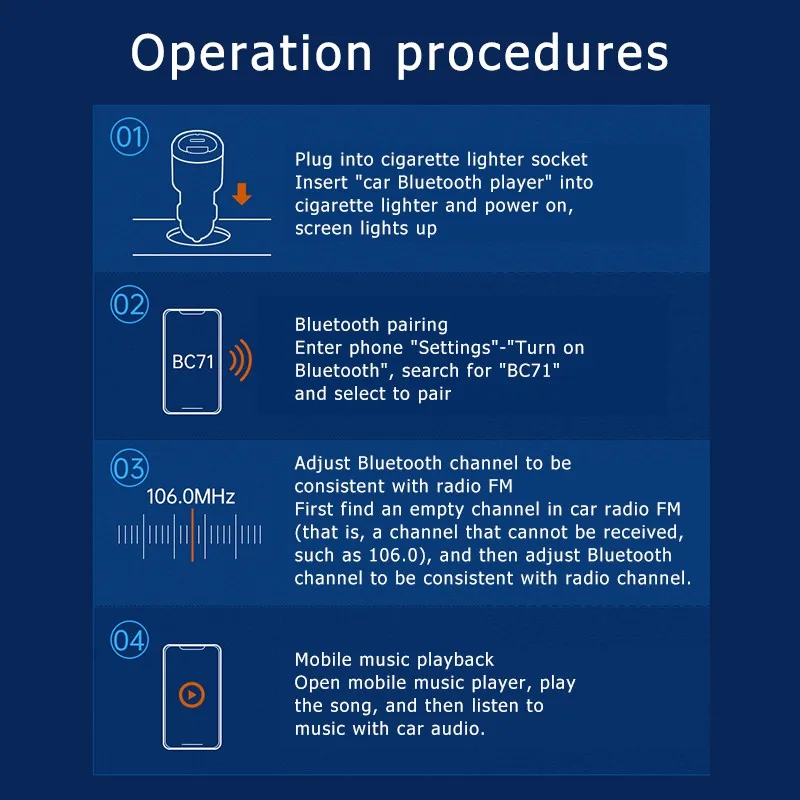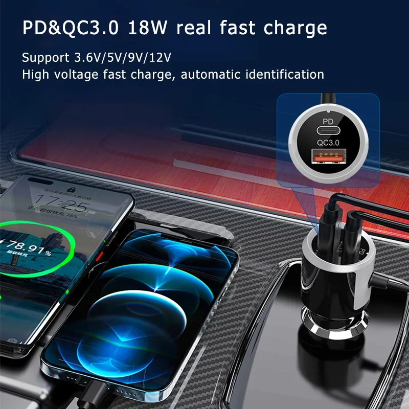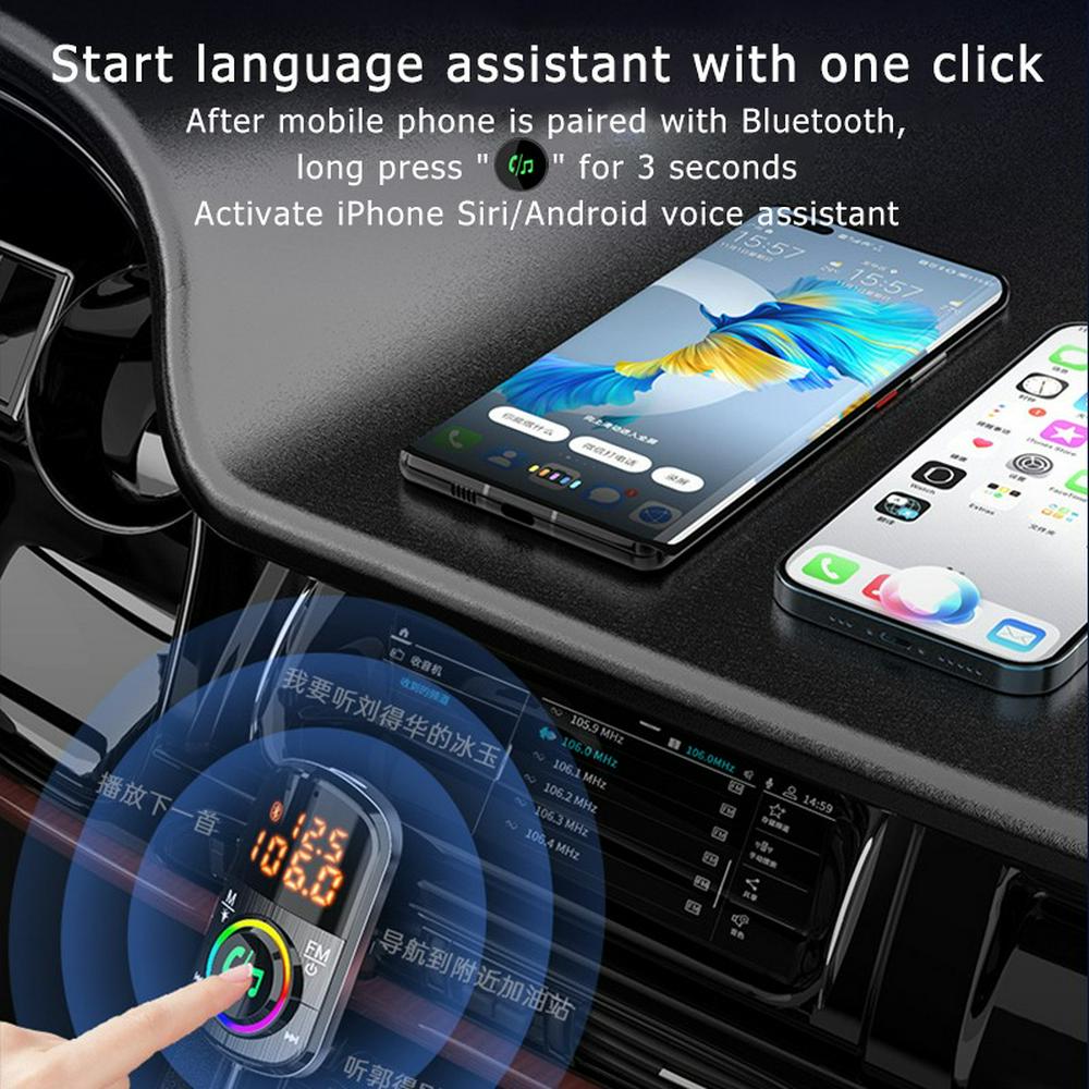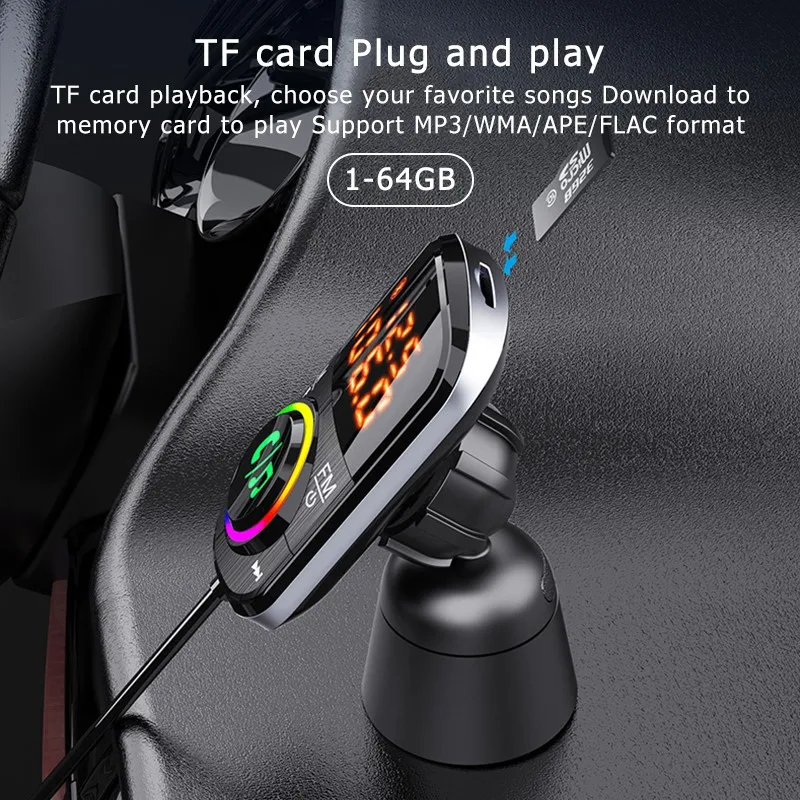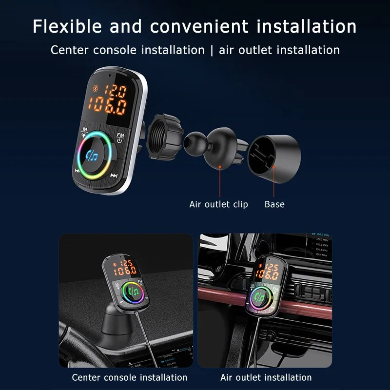 Rated working voltage: 12V-24V Limit working voltage: 10~26V USB1: QC3.0 (maximum 18W) Type-C: PD3.0 (Max 18W) Working temperature: 0~50℃ Support playback format: MP3 / WMA / WAV / FLAC S/N ratio>60dB Battery voltage error: ±0.5V Bluetooth version: Version 5.0 Bluetooth sound processing: support DSP, A2DP Bluetooth transmission distance: 10M Bluetooth microphone effective distance: 0.5~2M FM transmitting frequency: 87.5~108Mhz Features: 1. Bluetooth version Bluetooth V5.0 2. Support dual display digital tube, real-time detection and display of battery voltage 3. Support orange USB port (QC18W), Type-C port (PD18W) 4. Support colorful atmosphere lights 5. Support button to wake up the phone voice assistant 6. Support stereo FM transmission technology 7. Support TF card playback, support WAV/FLAC and other lossless music 8. Support music, volume, frequency point power off memory function 9. Support Bluetooth automatic connection 10. Bluetooth supports A2DP, AVRCP, HFP, HSP 11. Support Bluetooth stereo music DSP technology 12. The product supports input over-voltage protection, output over-current protection, output short-circuit protection, over-temperature protection