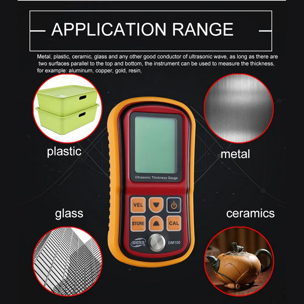 Sound velocity measurement: With a given thickness by a sample hardware to measure the sound velocity, which avoid the further conversion or consultation of the table.