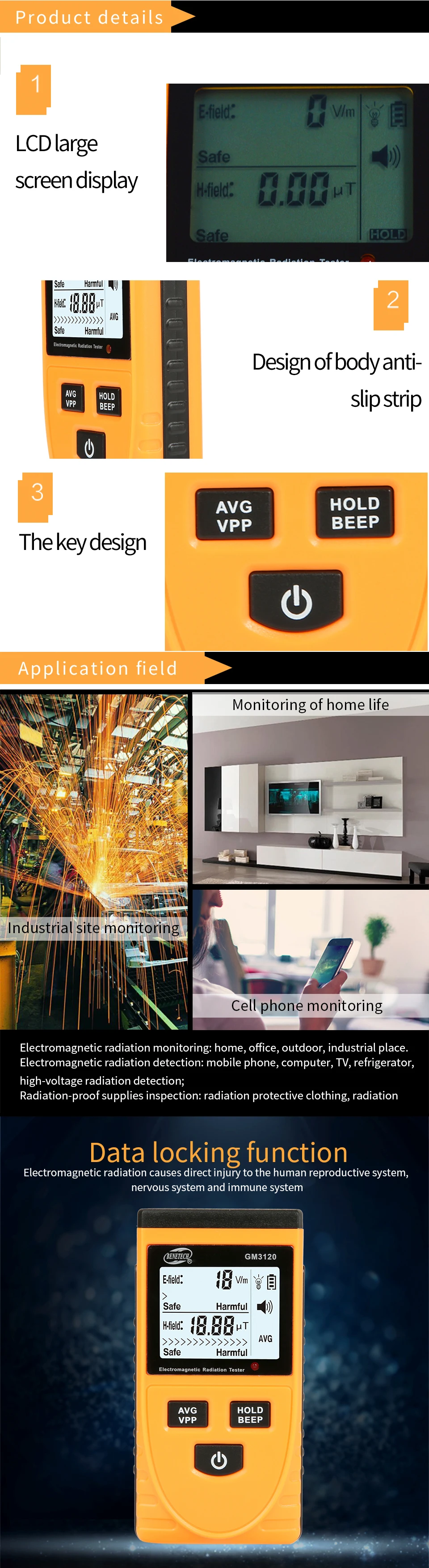 Range: electric: 1-1999V / m, magnetic 0.01-19.99μT