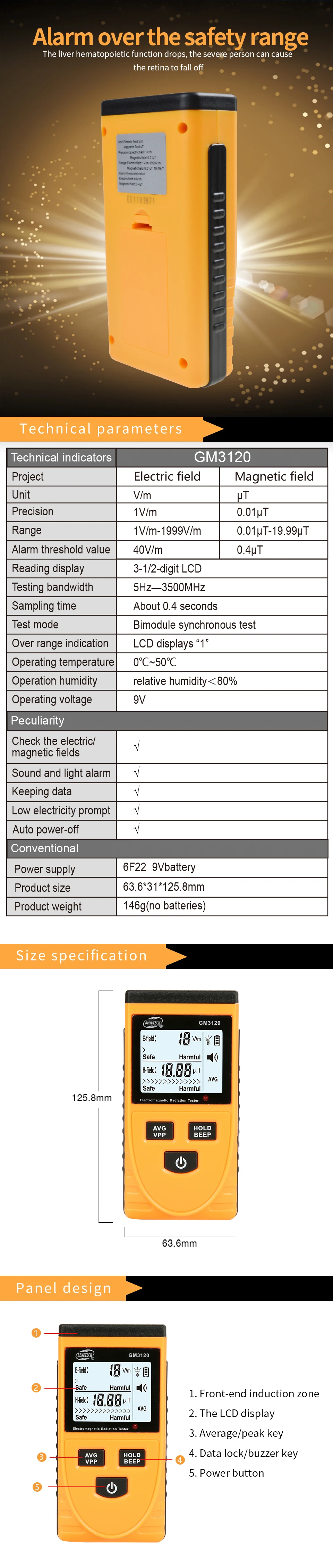 Alarm Threshold: electric: 40V / m, magnetic 0.4μT