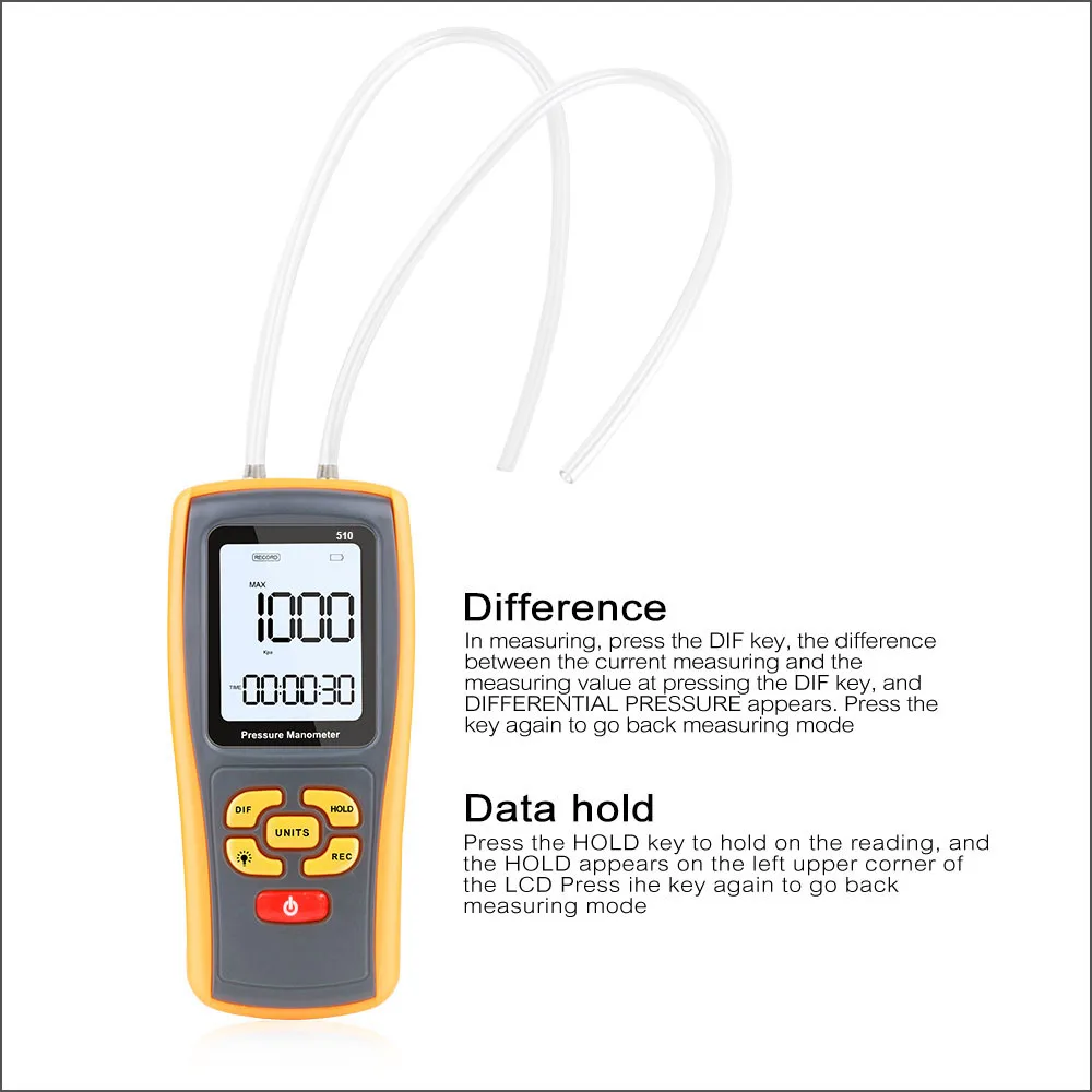 This manometer is widely used in measuring fan pressure, wind speed, oven pressure, and hydraulic system. This manometer can also be used in controlling the gas ratio in combustion and value control and monitoring the blood pressure and breath pressure with other medical devices.