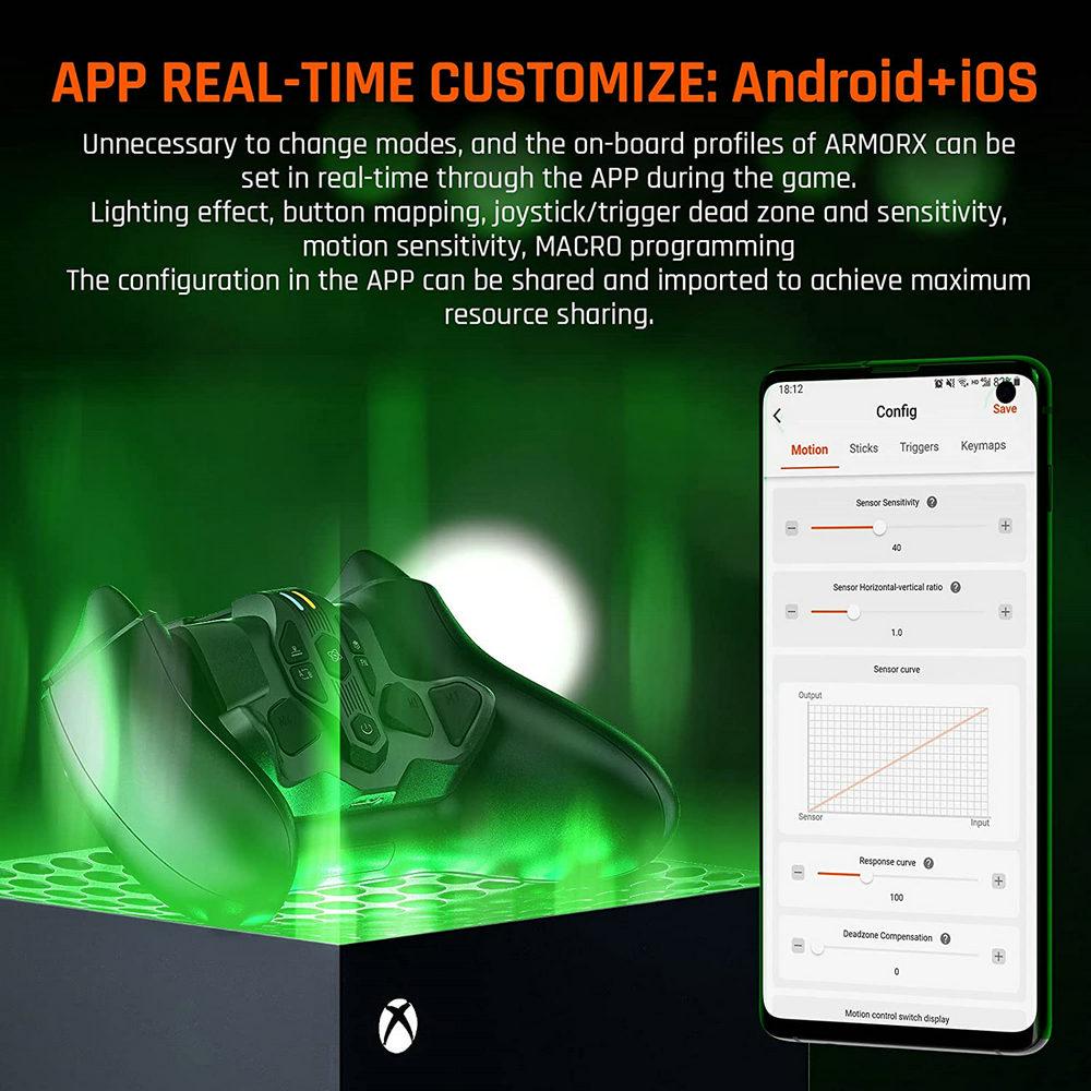 10).Support setting the on-board profiles, lighting effect, button mapping, joystick/trigger dead zone and sensitivity, motion sensitivity and MACRO programming via the APP.