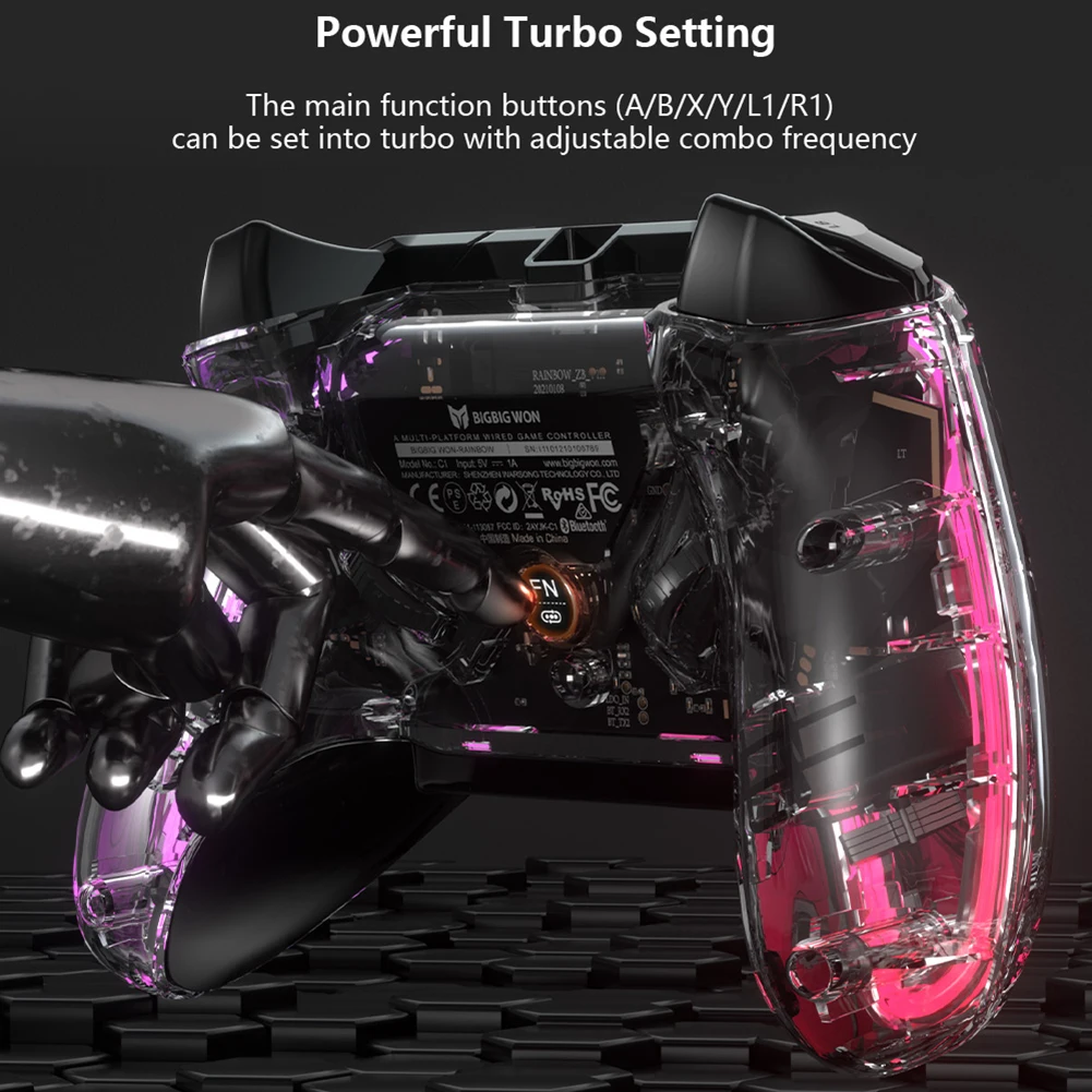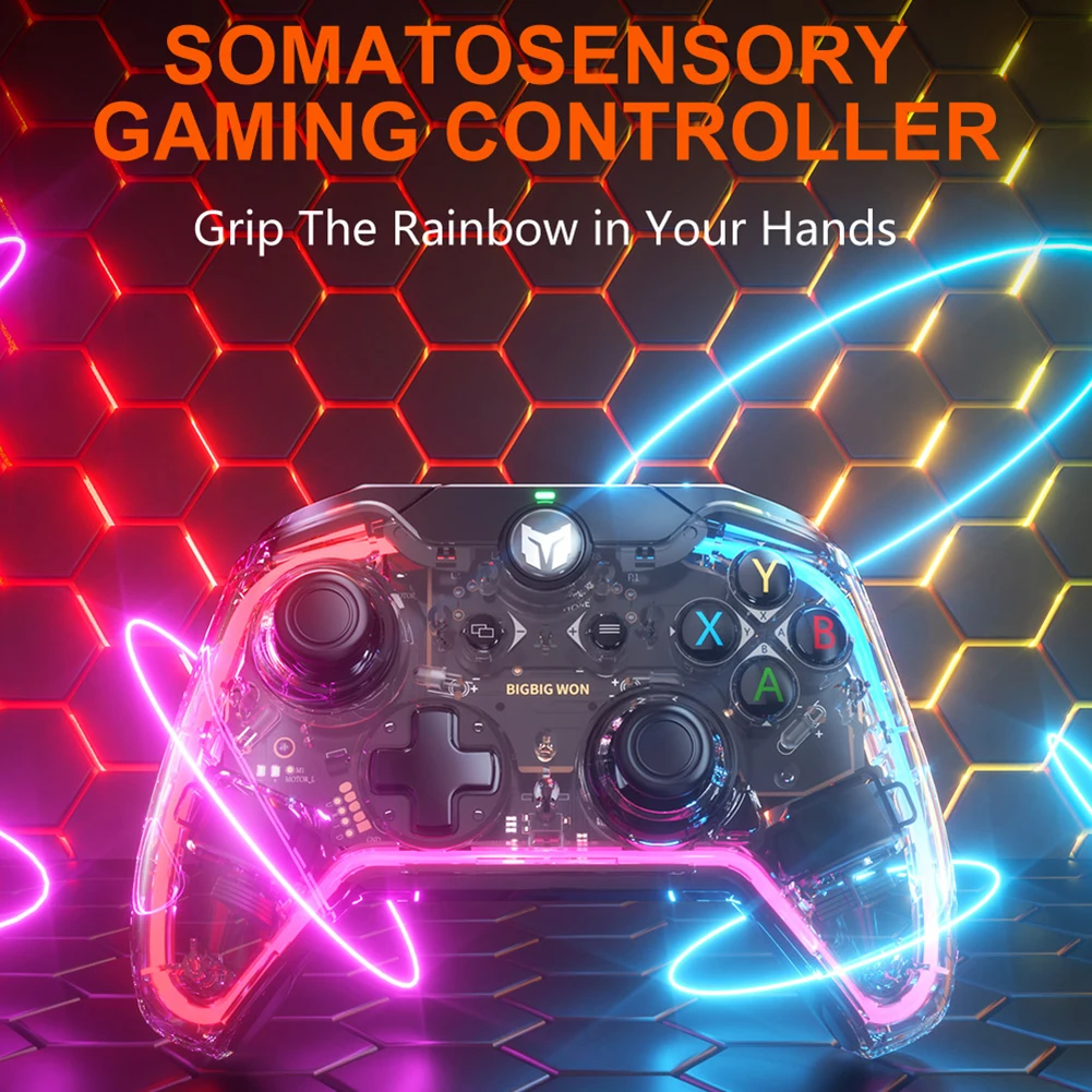 Dedicated Bluetooth-Compatible chip to connect mobile phone APP: firmware upgrade, real-time APP setting (light effect setting, dead zone and sensitivity of buttons, rockers and triggers, global somatosensory sensitivity)