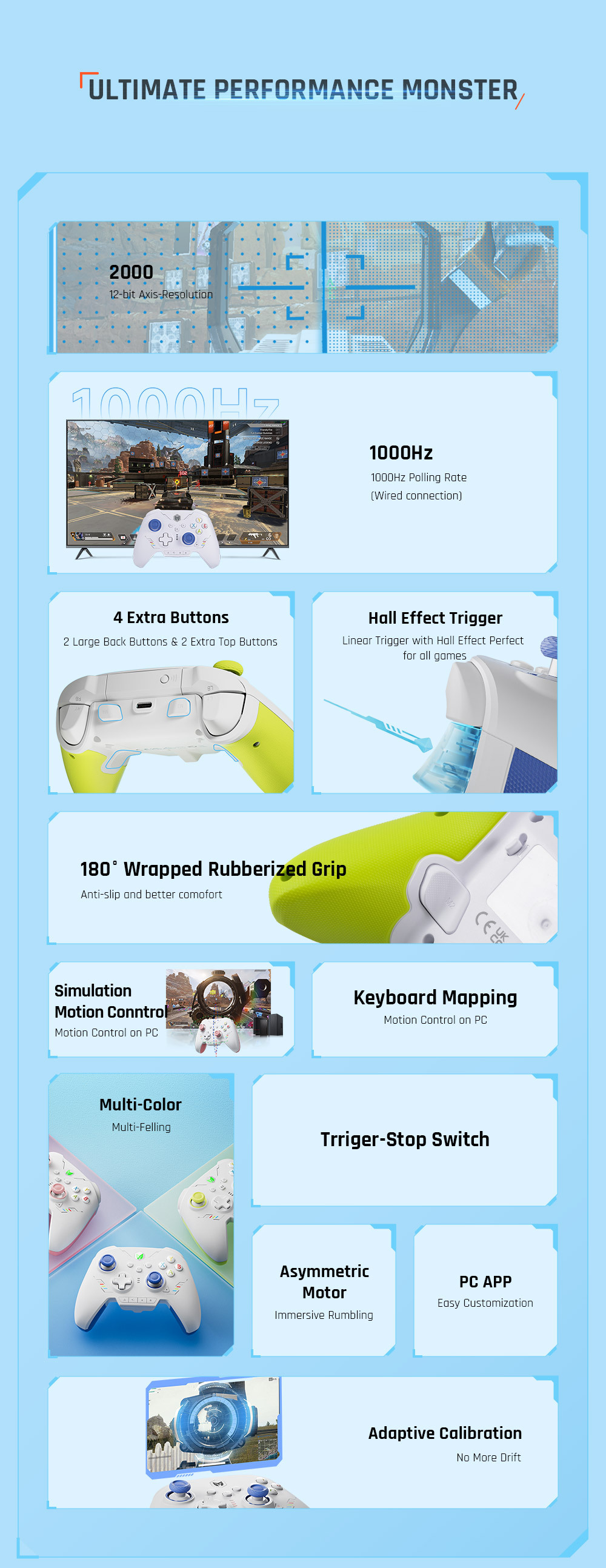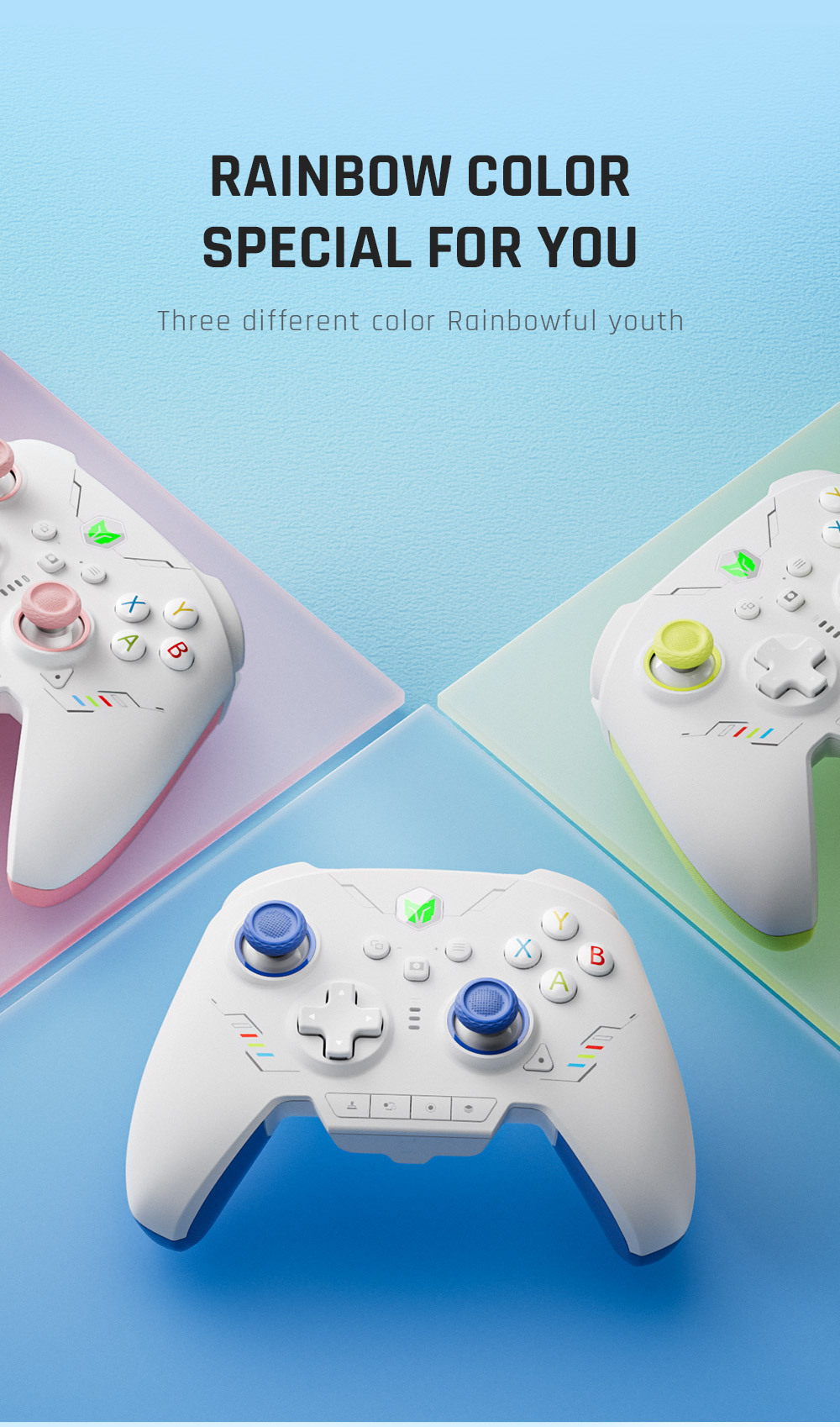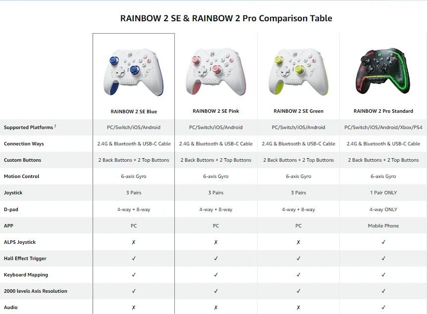 【Multi-platform Gaming Controllers】Wireless PC controller Rainbow 2 SE works for Switch,Windows10&11,Android7.0+,iOS14.0+. PC controllers are designed with 2 custom back buttons,2 top buttons,motion aiming,Turbo,Marco,dual motor,hall-effect triggers,3 sets of joysticks,4-way & 8-way D-pads,1000Hz wired polling rate,2000 levels axis resolution,built-in Bluetooth,keyboard mapping,App on PC (Not support on mobile). 【Audio is NOT supported】