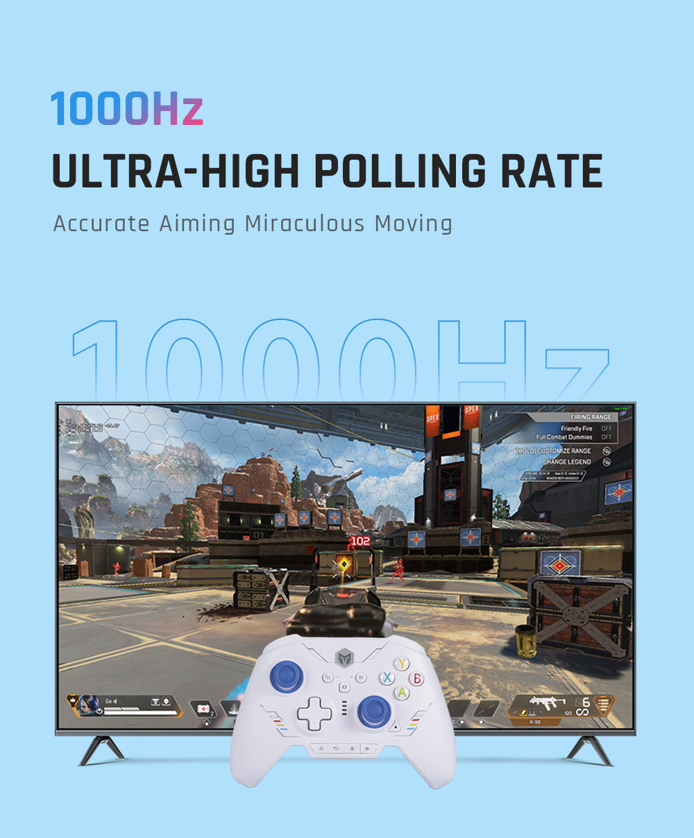 【2.4G USB & Bluetooth & Wired Connections】Wireless gaming controller assists you in playing games with ease via 2.4G wireless dongle,Bluetooth or a USB cable connecting to various consoles,providing extremely reliable signals and connection without any interference and also helping play games more freely and flexibly compared with other game controllers. 【Ultra-high Polling Rate】Wired polling rate: 1000Hz,2.4G & Bluetooth wireless polling rate: 125Hz.