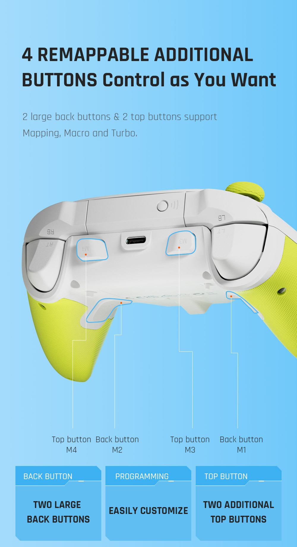 【4 Customize Buttons】2 Back buttons & 2 top additional buttons pc controllers for gaming provide the function of Macro,Turbo,and Remapping the buttons. 【Macro】32 steps Macro saves your time and makes the editing easily. 【Dual Motor Vibration】PC game controller gives you immersive gaming experience. Try your favourite intensity from RAINBOW 2 SE 255-level vibration.