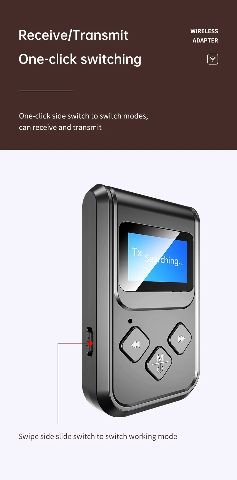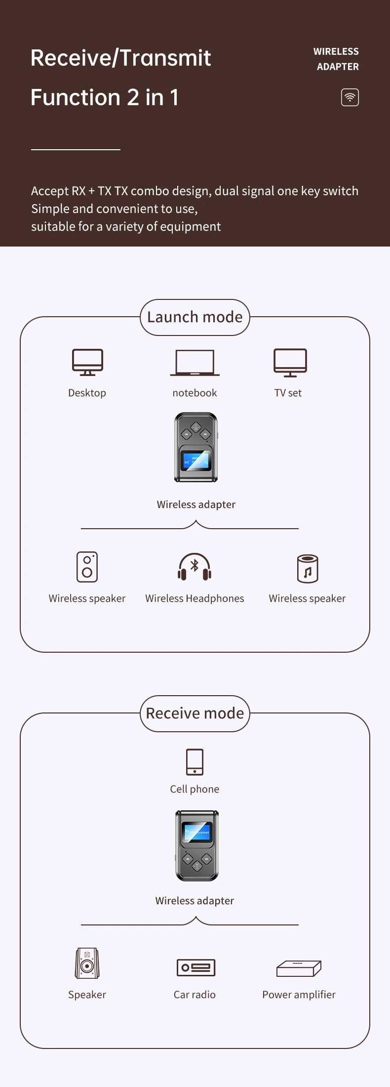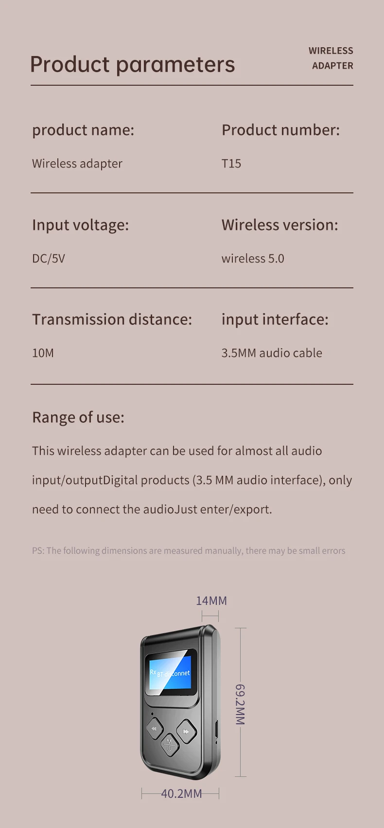 2 in 1 Bluetooth transmitter & receiver, as a Bluetooth audio transmitter, t15 is specially developed for audio devices (such as MP3, MP4, TV and PC, etc.) without Bluetooth function. You can connect the Bluetooth transmitter to the audio devices without Bluetooth function via the included 3.5mm audio plug, change these audio devices into bluetooth enabled audio devices, and that it will work with bluetooth enabled headset and speaker;