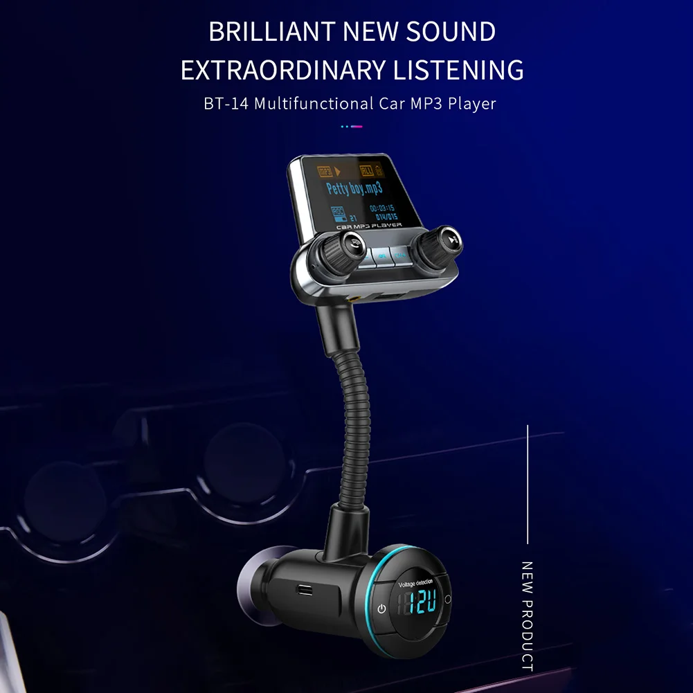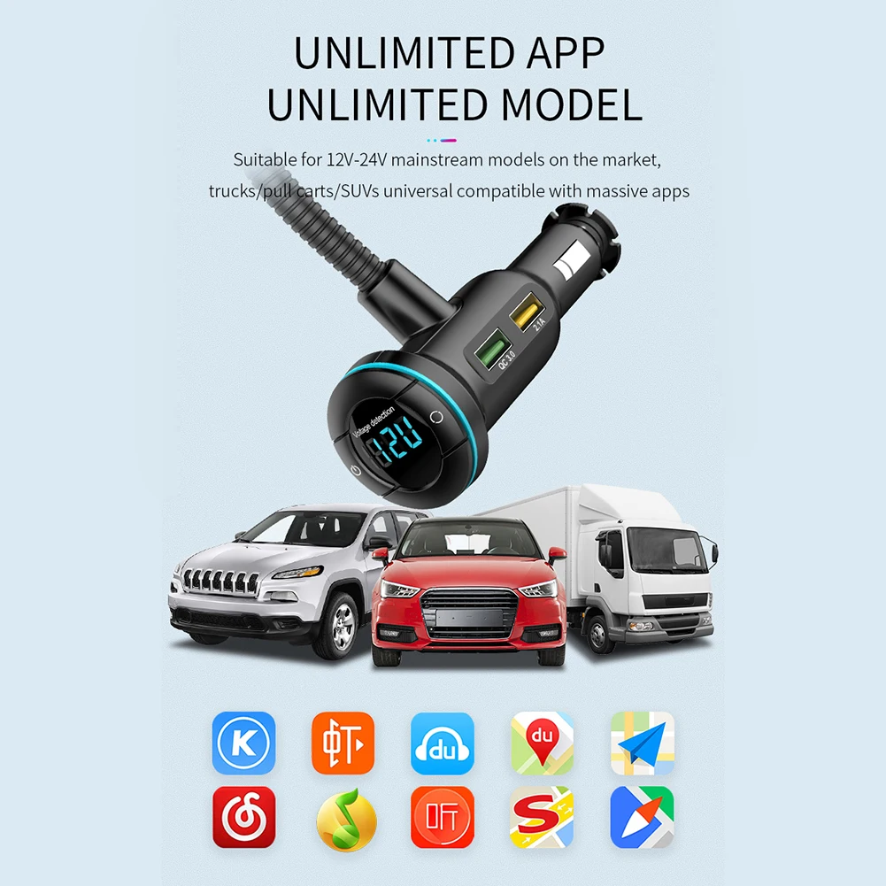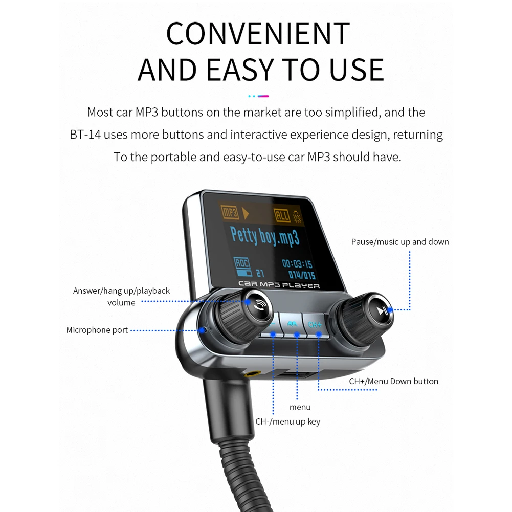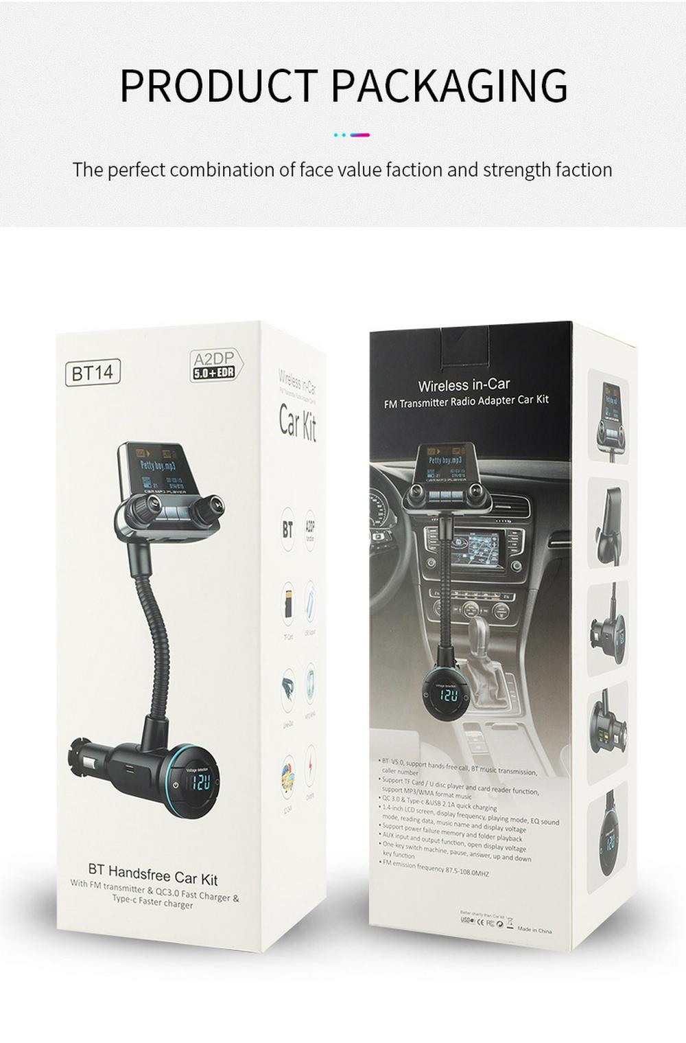1. Bluetooth 5.0, support Bluetooth handsfree call, Bluetooth music transmission, caller ID; 2. Support TF card / U disk play function, support MP3/WMA music; 3. The 2.1A Type-C / QC3.0 fast charge/2.1A charging port can charge externally expanded portable devices; 4. 1.4 inch LCD dot matrix screen, can display frequency, file name and working status information; 5. Support one-key menu to set language, play mode, EQ mode, loop mode; 6. Support power-off memory and folder playback functions; 7. AUX input and output functions; 8. One-key on/off, pause, answer/hang up/up and down key functions; Specification: Bluetooth version: 5.0+ EDR Bluetooth sound processing: A2DP Bluetooth microphone effective distance: 0.5-2m Bluetooth transmission distance: 10m Display: 1.4 LCD dot matrix screen + digital display TF & U Disk: up to 128GB (not included) Music format: MP3 / WMA FM transmitting frequency: 87.5-108.0MHz Working voltage: 12-24V Working temperature: 0~40 degrees C Distortion: <0.1 Signal to noise ratio: >60db AUX: Input and output USB charging: 5V /2.1A+QC3.0+2.1A USB Type-C fast charge Colour: Black Size: 195*80mm/7.68*3.15" Note: 1. There may be slight size deviations due to manual measurement, different measuring methods and tools. 2. The picture may not reflect the actual color of the item because of different photographing light, angle and display monitor. ![]()