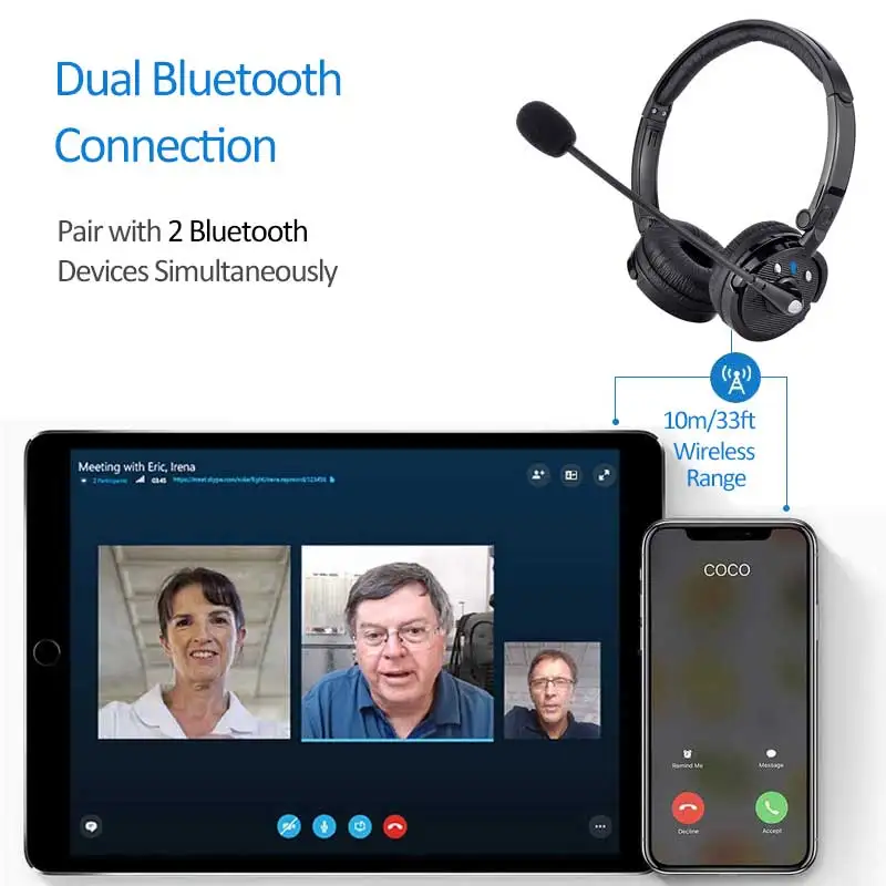 1. Multipoint Connection: The wireless Bluetooth headset can connect 2 Bluetooth-enabled devices (smartphone,tablet,PC etc) at the same time.