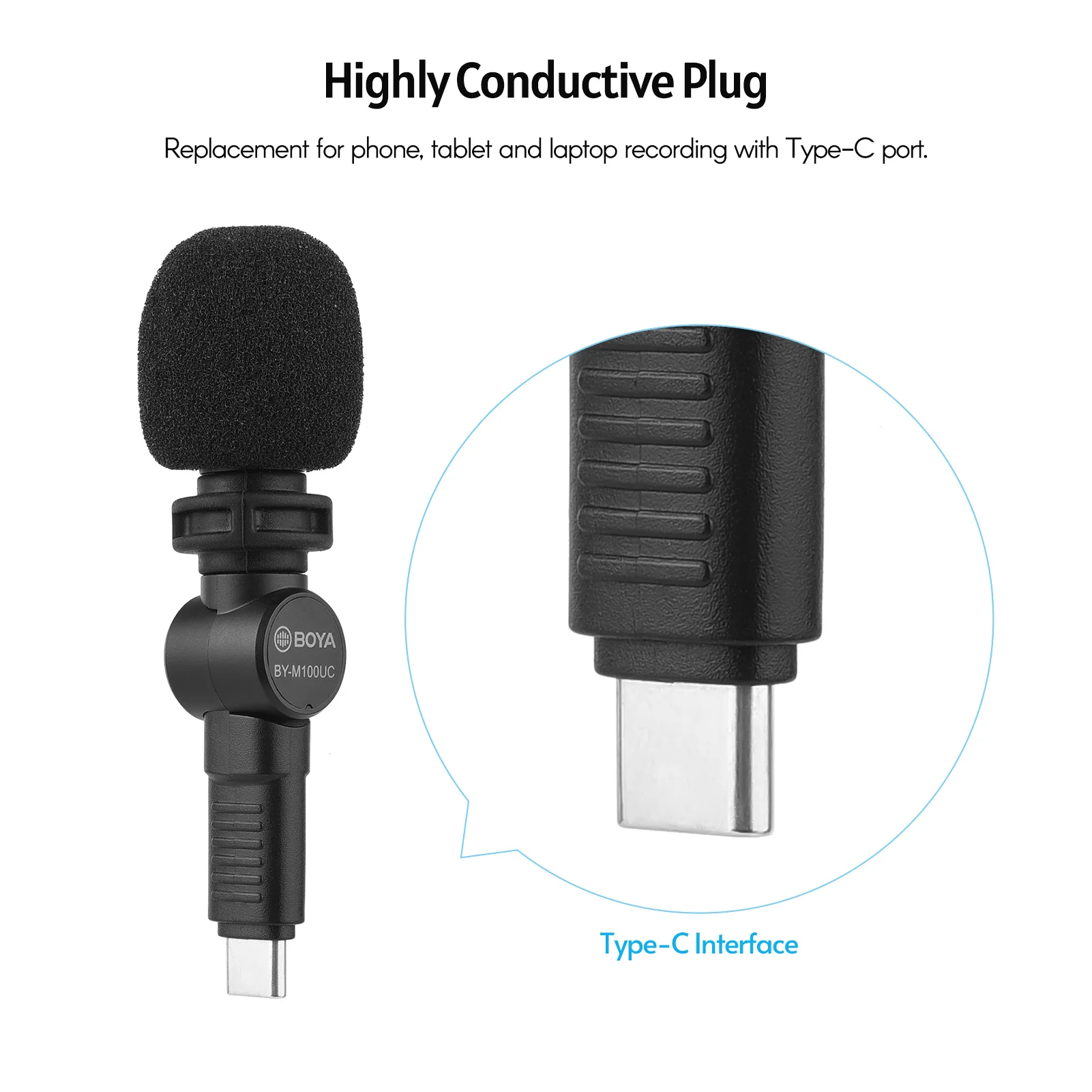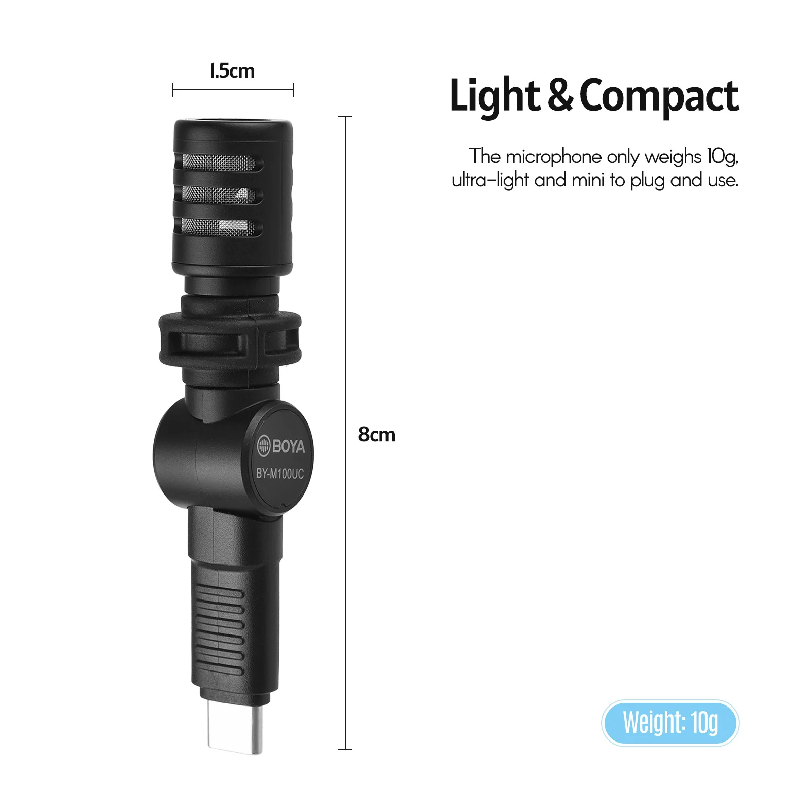 The microphone features Type-C connector, useful recording device as replacement for Android smartphone, tablet and laptop with Type-C interface.