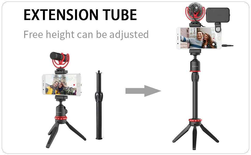 - Includes BY-MM1+ shotgun microphone, LED light, smartphone ball head, extension tube, mini tripod, lamp with cold shoe mount