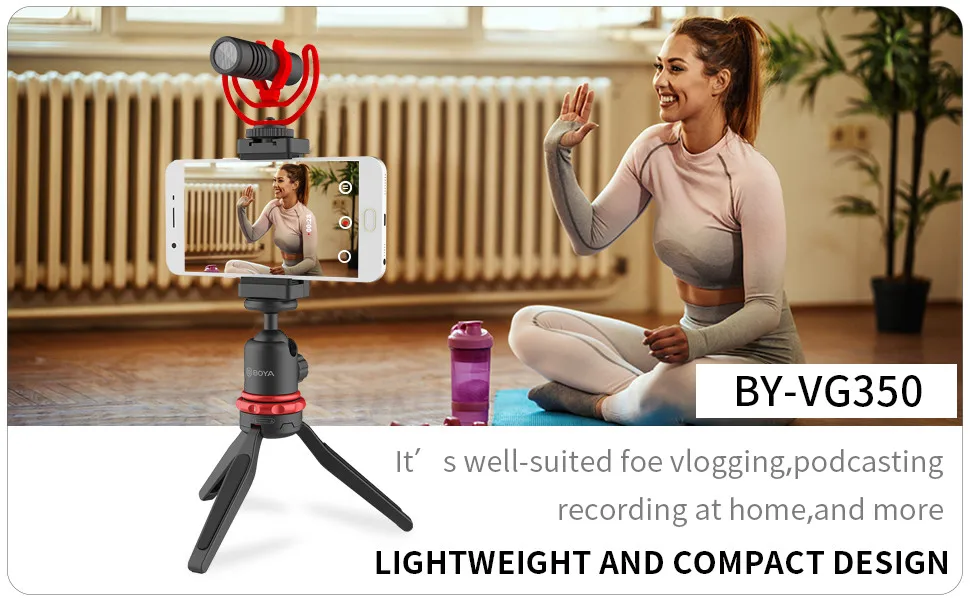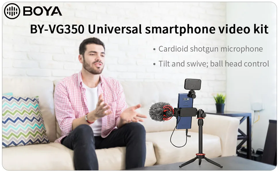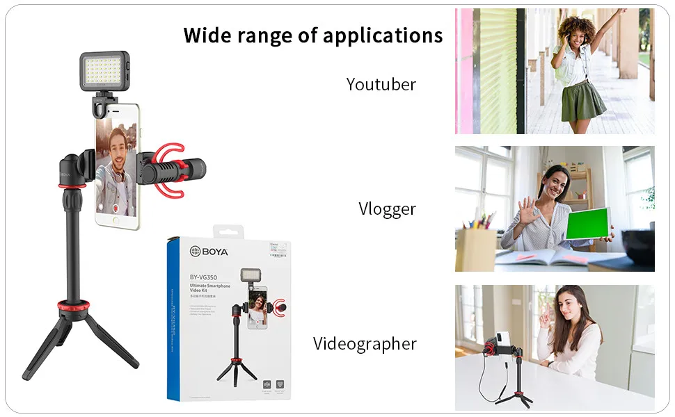 BY-VG350 is an all-in-one smartphone video kit that consists of BY-MM1+ shotgun microphone, LED light, smartphone clamp, ball head, extension tube, mini tripod, clamp with cold shoe mount.