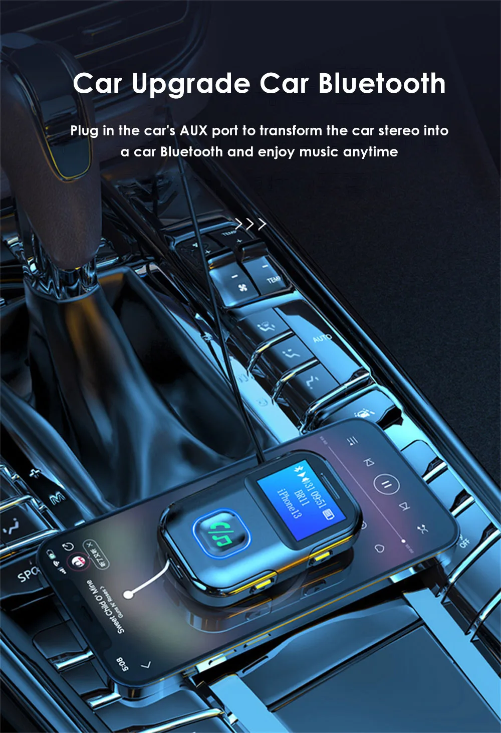 9. The car upgrade car Bluetooth is inserted into the car AUX port to transform the car audio into car Bluetooth and enjoy music at any time; The old audio upgrade Bluetooth audio is connected to the AUX audio socket, and the audio without Bluetooth function can be transformed into Bluetooth audio. The earphone is inserted into the 3.5mm audio port and instantly becomes a Bluetooth earphone, and the old earphone shines again.