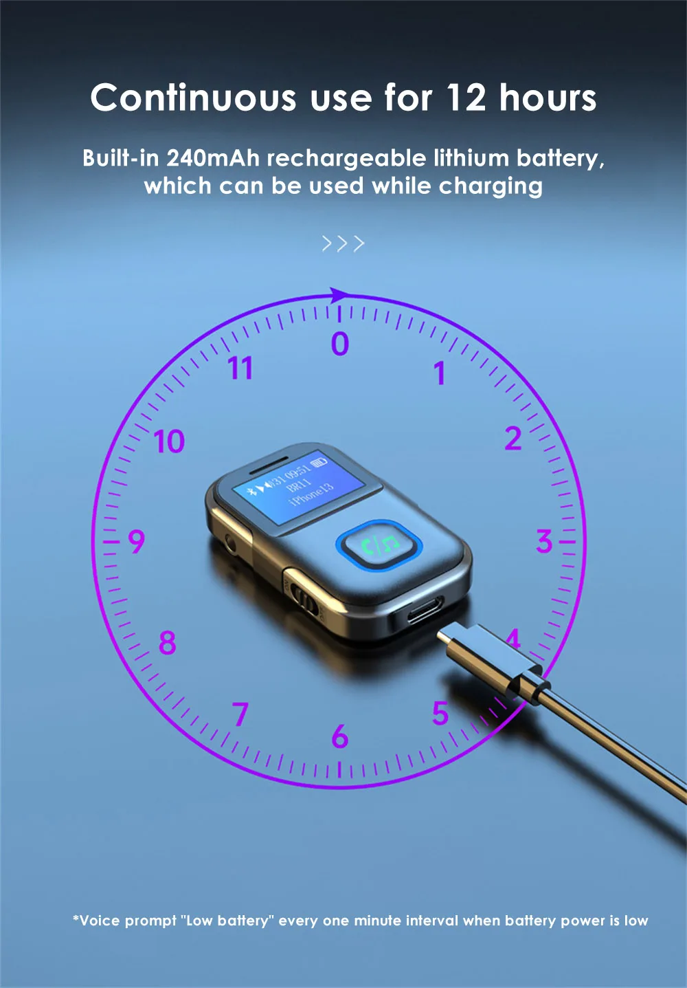 5. Continuous use for 12 hours, built-in 240mAh rechargeable lithium battery, can be used while charging, lasting.