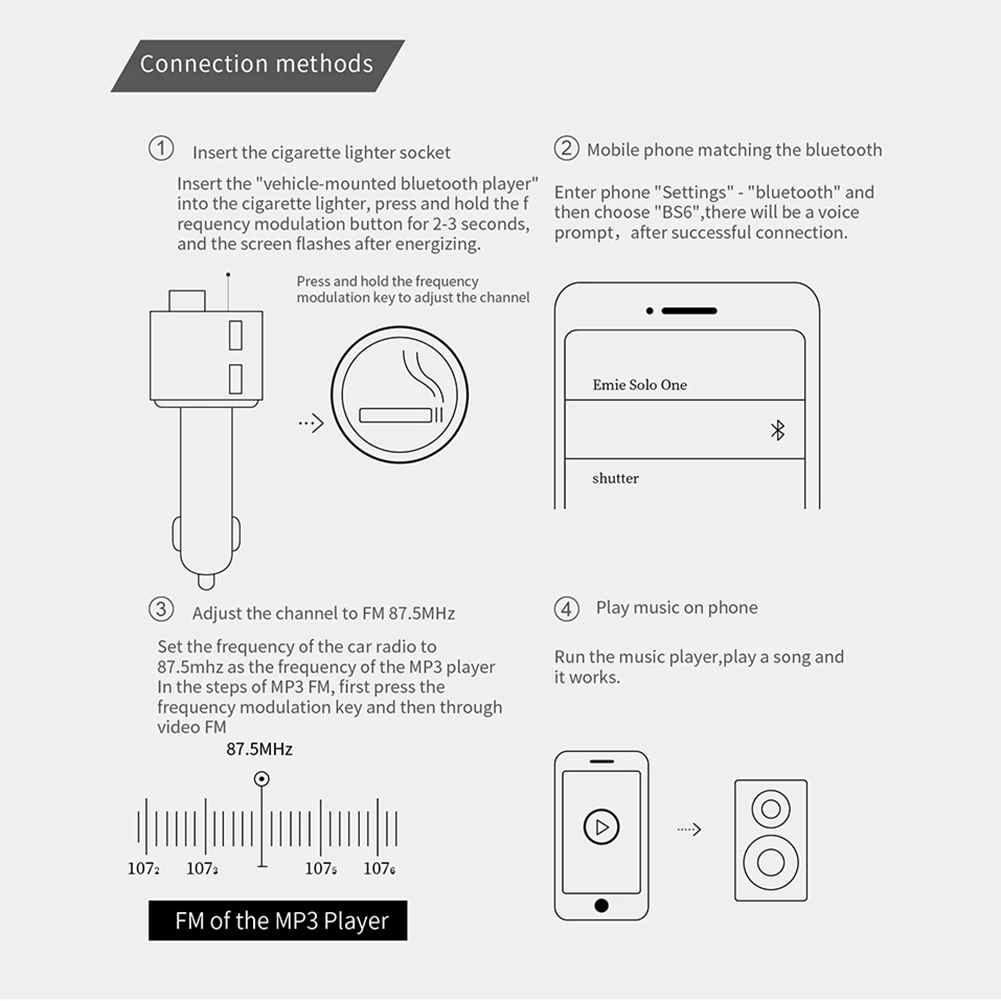 stereo music playback Bluetooth, can be transmitted to the car stereo through fm, you can also enjoy clear music
