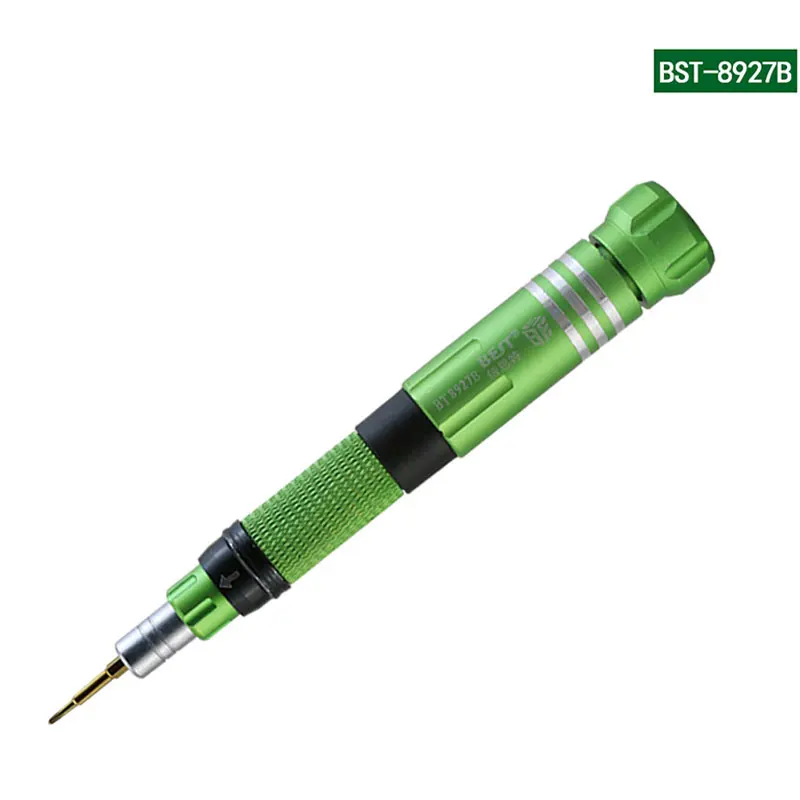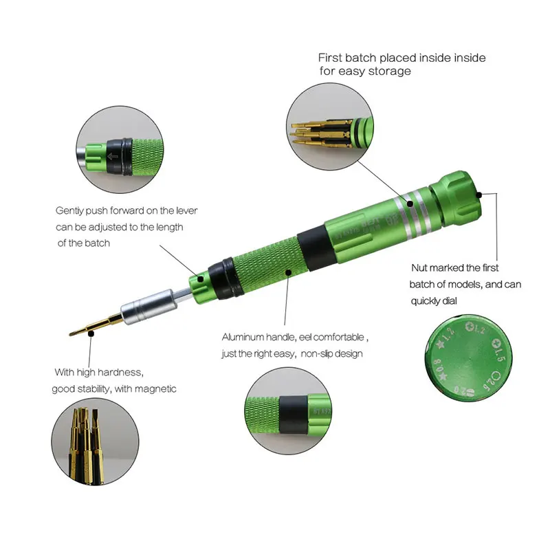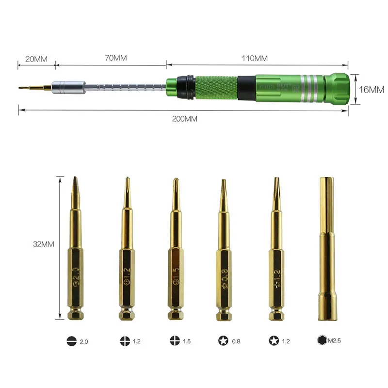Precision screwdriver set for electronics repair. Widely used on repairing mobile phones,computers, watches,glasses...etc 360 Rotation top,non-slip handle. 0.6 Y Bit fits for iPhone 7 / 8 / X for Apple Watch. 0.8 Pentalobe Bits are for iPhone / MacBook. 6 pcs Bits are inside the screwdriver handle. Color:We will send random