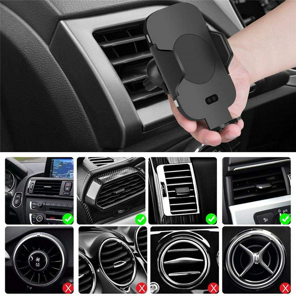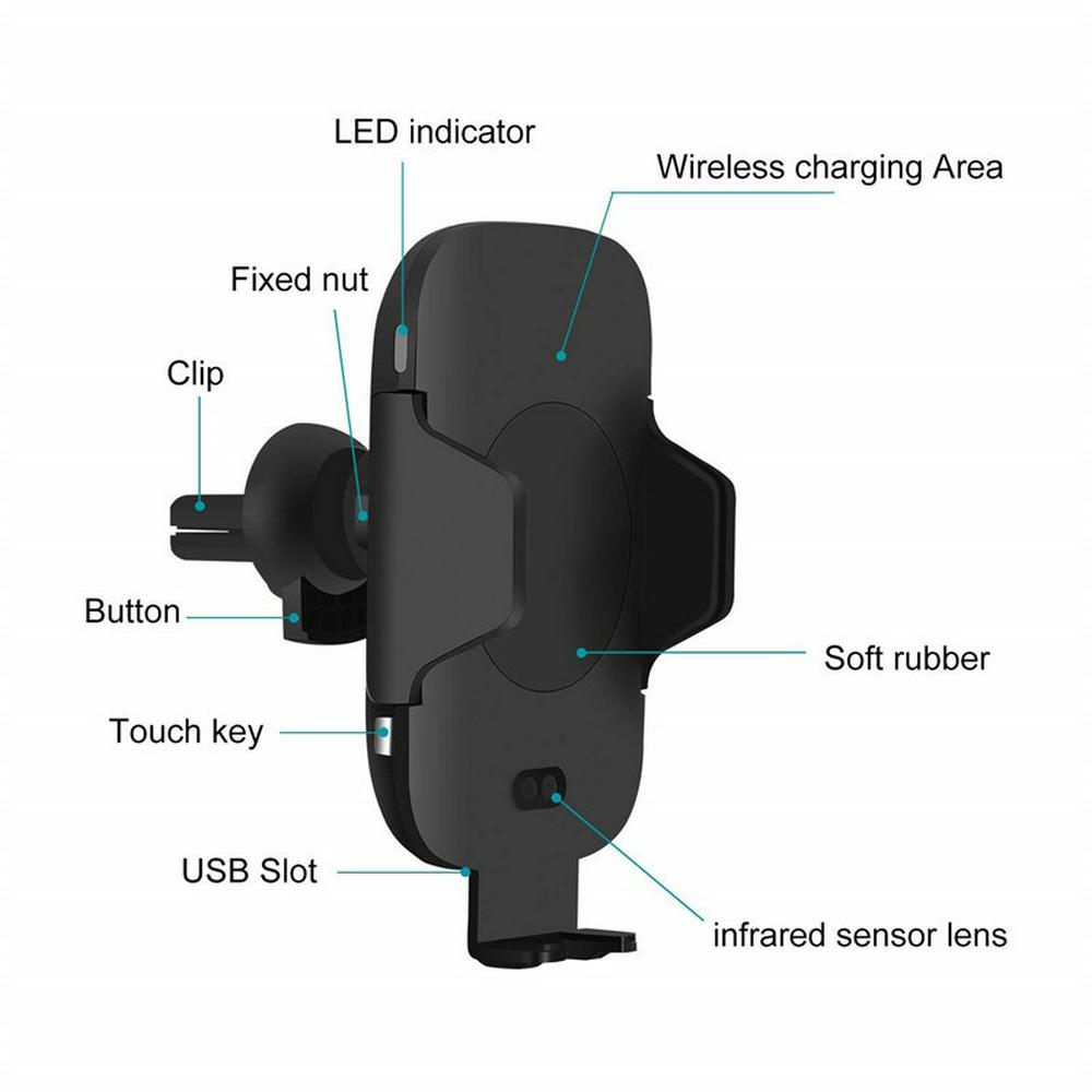 Fully automated wireless car charger with built-in advanced infrared sensor. The two clips automatically open and grip your phone when you close the phone to the holder. Easy to use and safe driving.