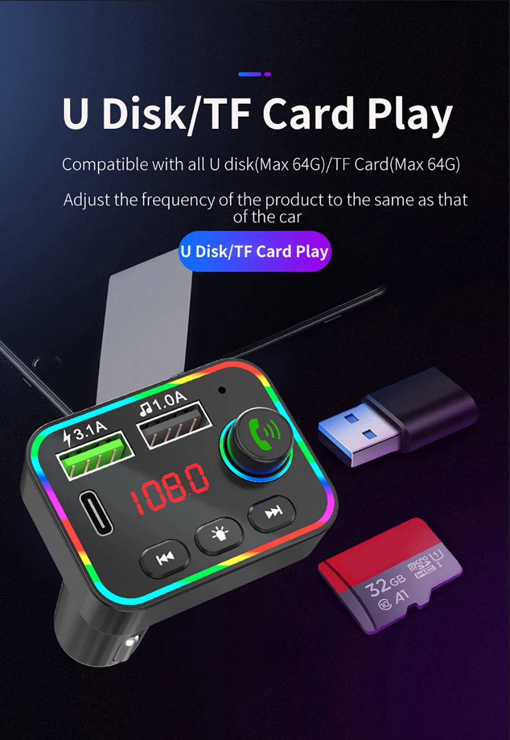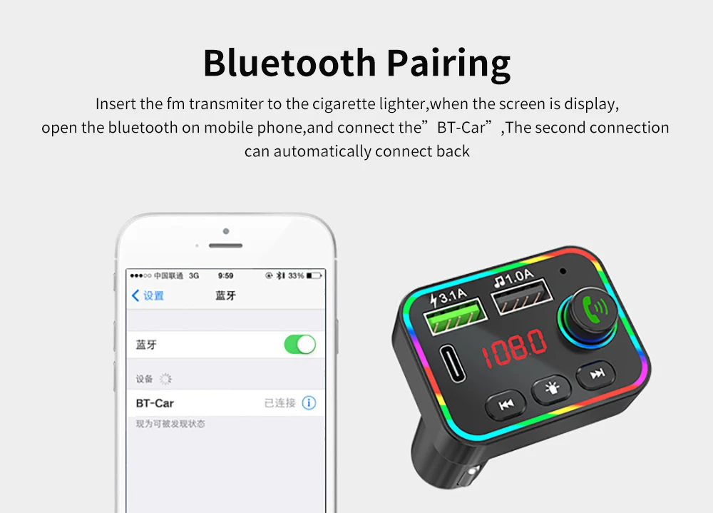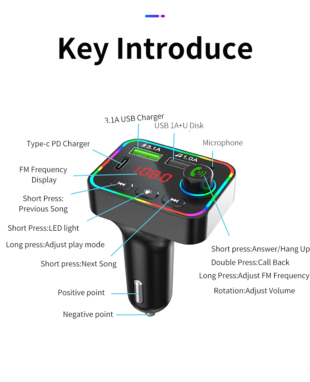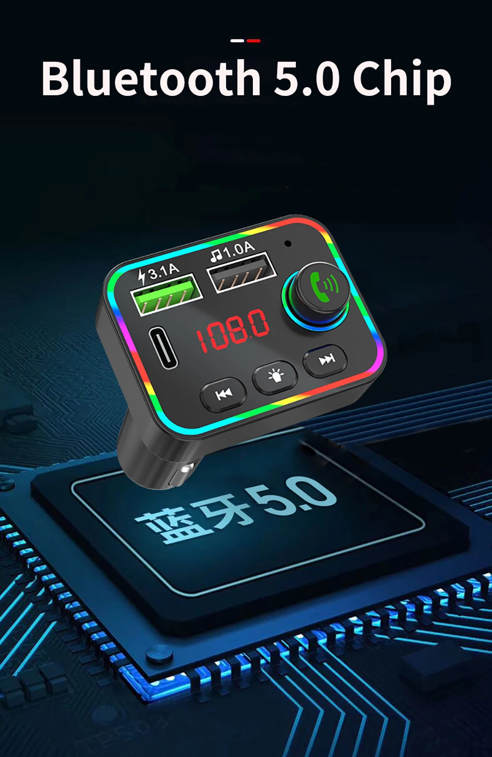 8: Bluetooth version 5.0 FM transmitting frequency: 87.5~108Mhz