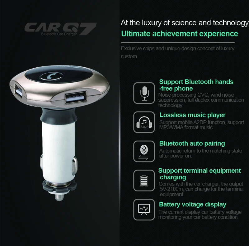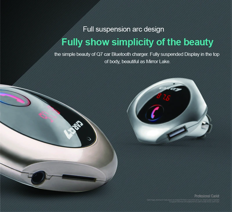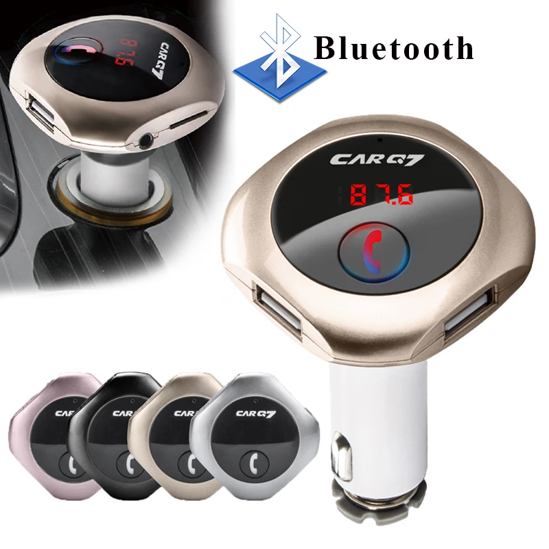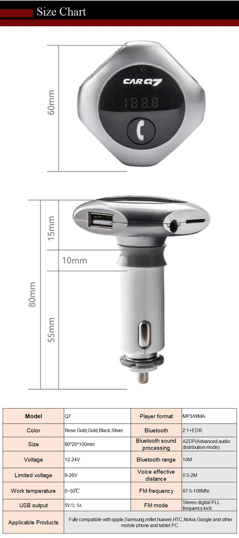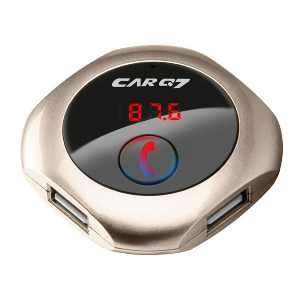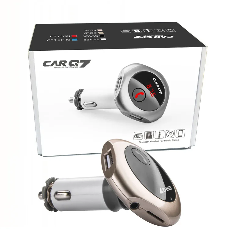 Model: car Q7 Color: silver, gold, rose gold,black Size: 80*20*100mm Working voltage: 12-24V Bluetooth transmit distance: 10m USB output: 5V/ 2.5A **Features: 100% brand new and high quality. Wirelessly transmit phone call from Bluetooth mobile phone to the car FM stereo system; You can play your music from Bluetooth device to car's FM stereo system. Switch to Hands-free mode automatically from music playing status when receiving calls. Digital display and it support line audio input. It has the power off switch. Bluetooth answer, hang up, reject, redial calls and other functions. Bluetooth stereo music play . It is suitable for all devices, such as for iphone, for samsung etc.