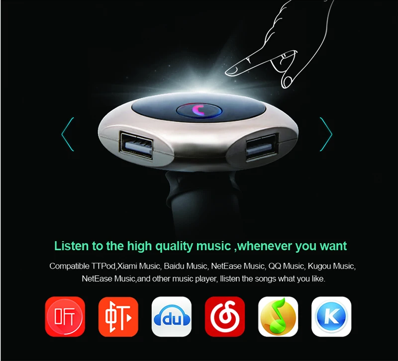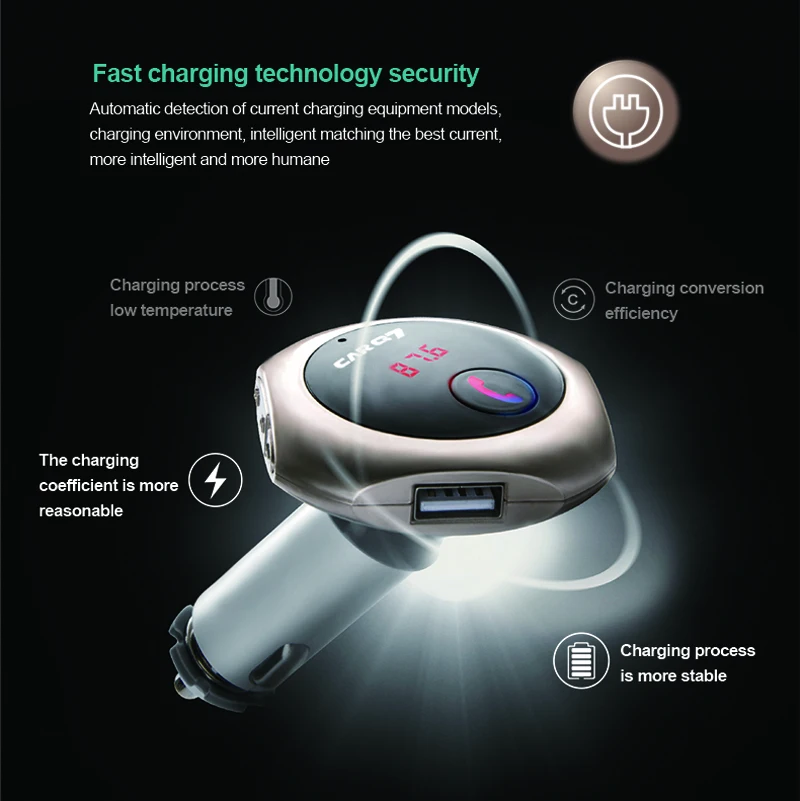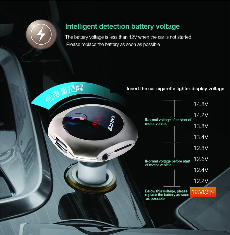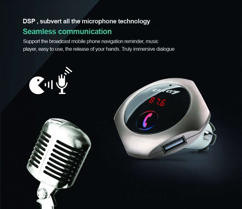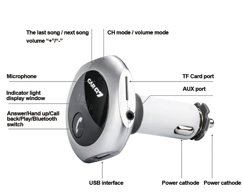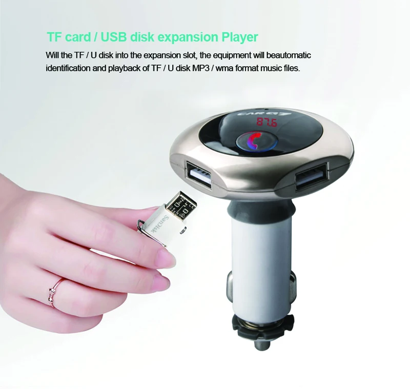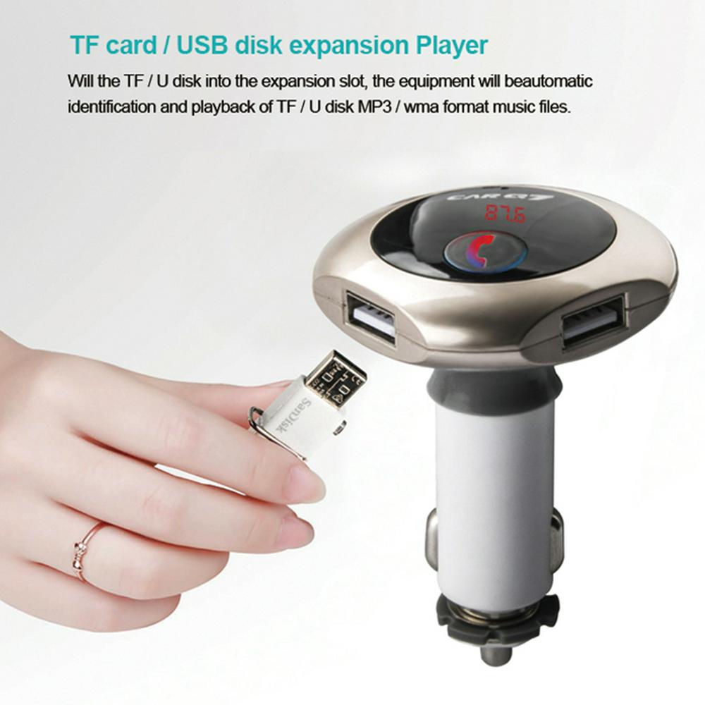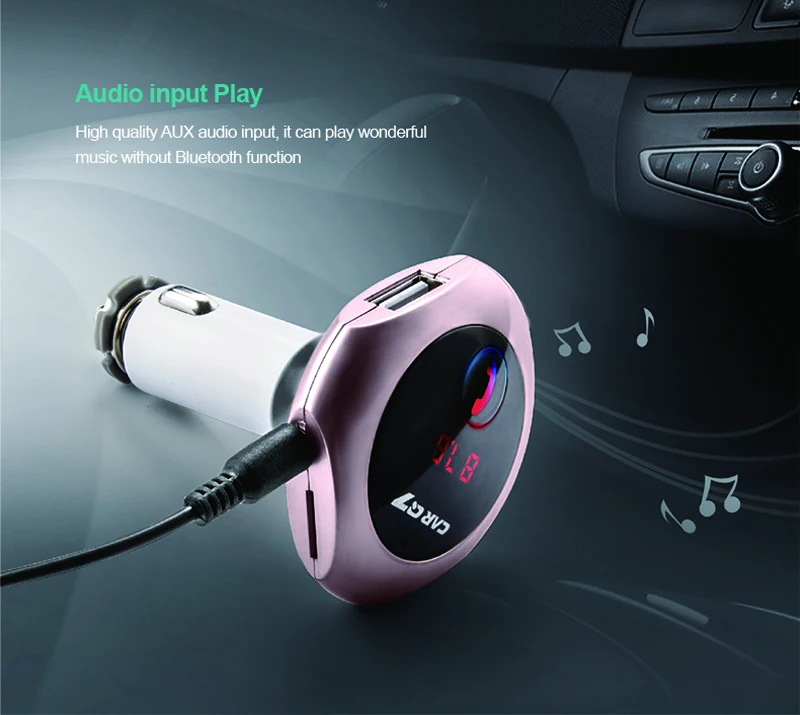 Model: car Q7 Color: silver, gold, rose gold,black Size: 80*20*100mm Working voltage: 12-24V Bluetooth transmit distance: 10m USB output: 5V/ 2.5A **Features: 100% brand new and high quality. Wirelessly transmit phone call from Bluetooth mobile phone to the car FM stereo system; You can play your music from Bluetooth device to car's FM stereo system. Switch to Hands-free mode automatically from music playing status when receiving calls. Digital display and it support line audio input. It has the power off switch. Bluetooth answer, hang up, reject, redial calls and other functions. Bluetooth stereo music play . It is suitable for all devices, such as for iphone, for samsung etc.