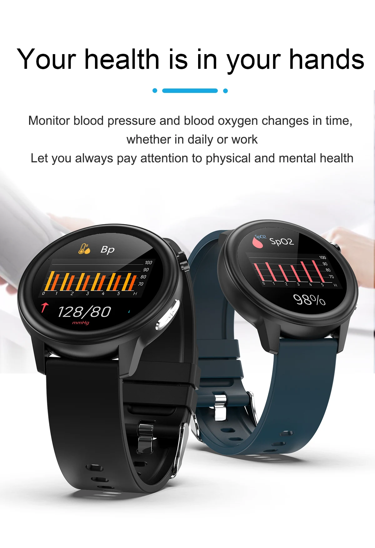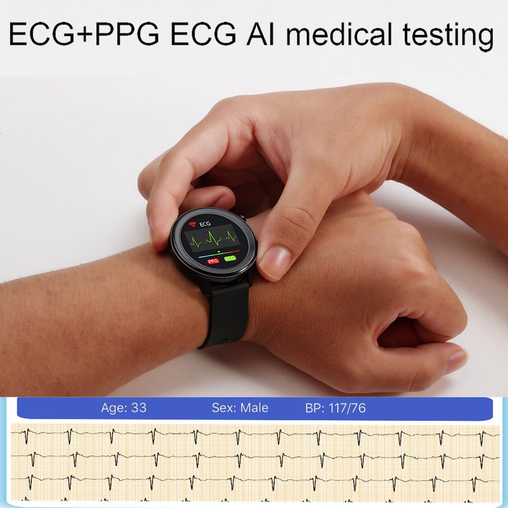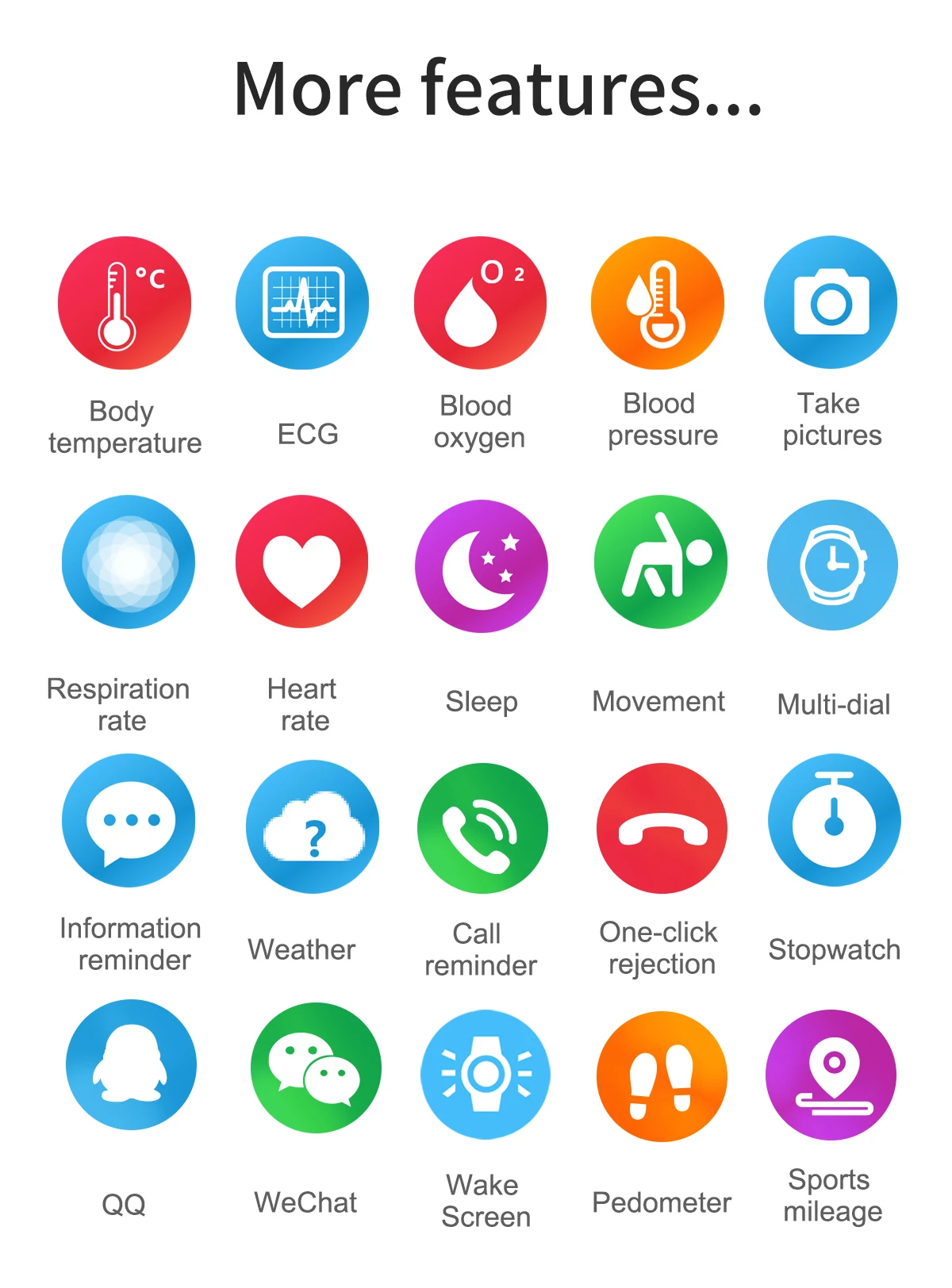 Temperature monitoring, blood oxygen monitoring, respiratory rate. ECG + PPG combined with ECG AI medical diagnosis. Exercise function: step count / calories / distance, Multi Sport mode. Heart rate monitoring, blood pressure monitoring and other health functions Remote care function Environmental friendly TPU / metal strap, hand to hand Wearable Wearable hardware + smart app + big data cloud service Wear it with you and control, display and record data through app. Compatible System:Android 4.4 and above,iOS 8.2 and above Waterpfoof Level:IP68