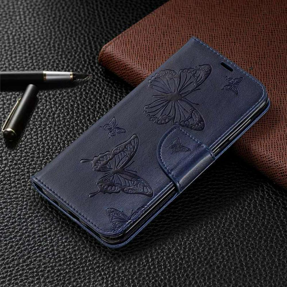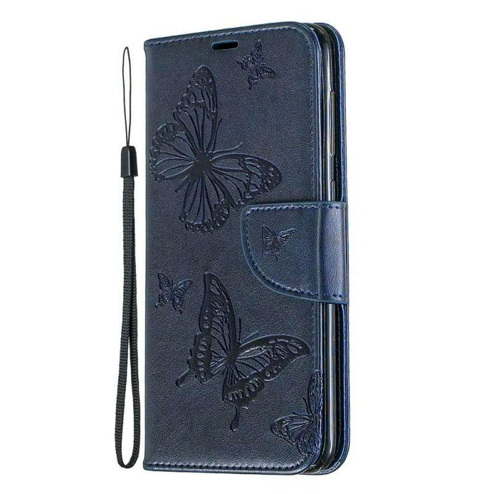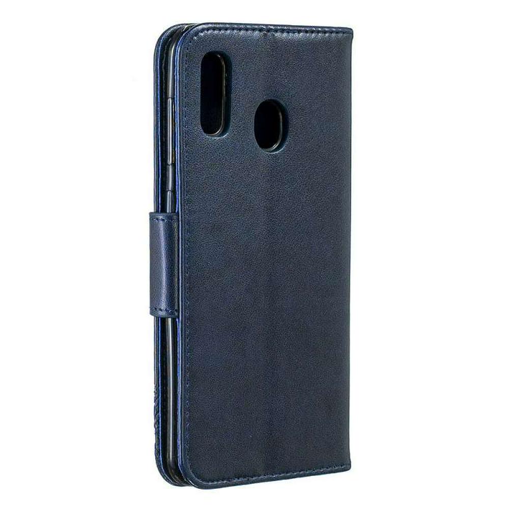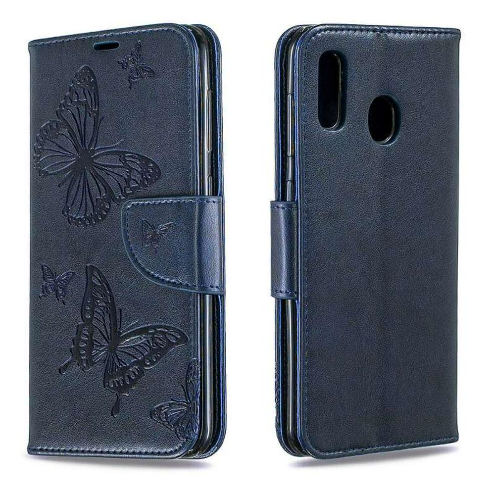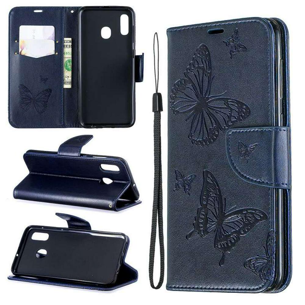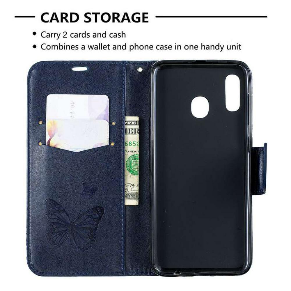 Embossed Butterfly and Flower with Wrist Strap PU Leather + Soft TPU with Card Slots and Stand Wallet Protective Case for Samsung Galaxy A20
