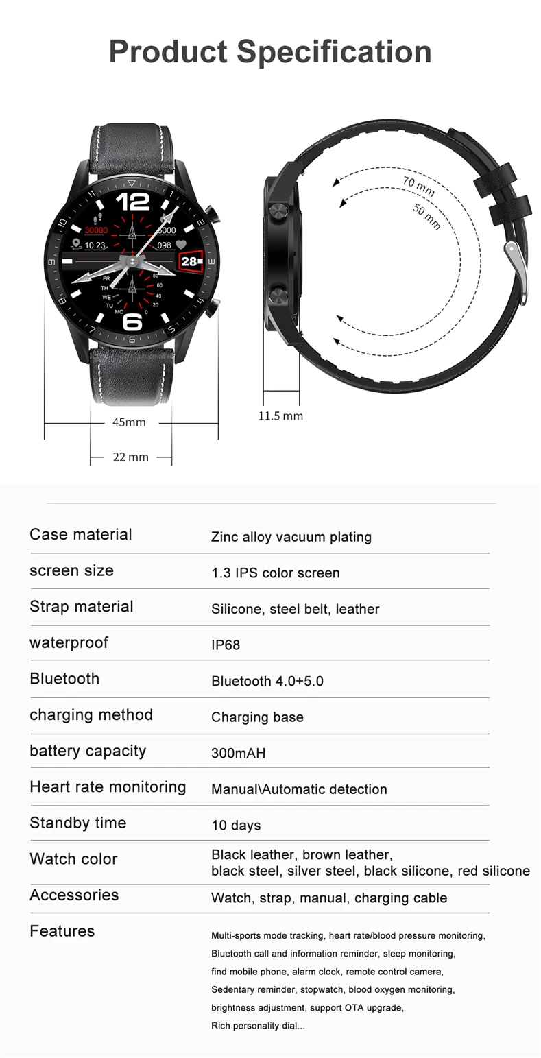 Pedometer,Sleep,Heart rate,Blood pressure,Blood oxygen,Multi-sport mode,Watch face Selection,Countdown,Stopwatch,Restore,Alarm clock,Sedentary reminder,Shake to take photos,Find phone,Bluetoothcall,Information viewing,etc. (use after connecting to Bluetooth)