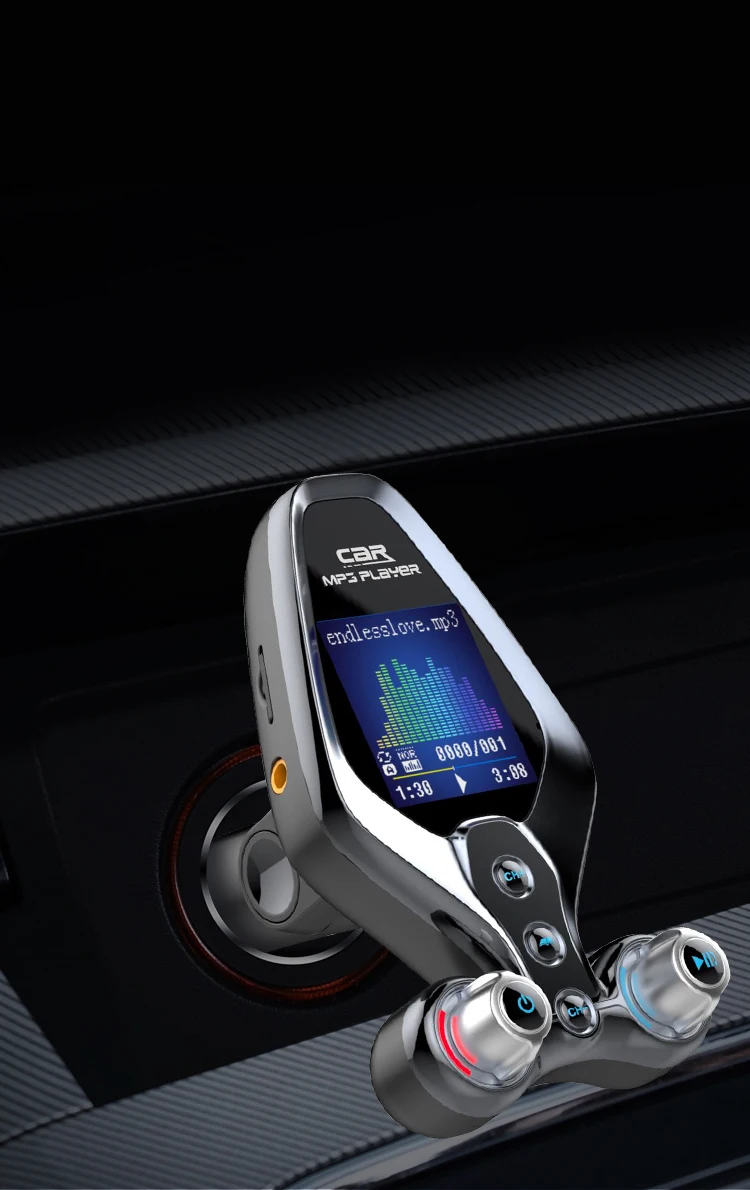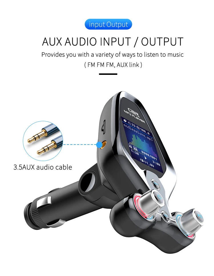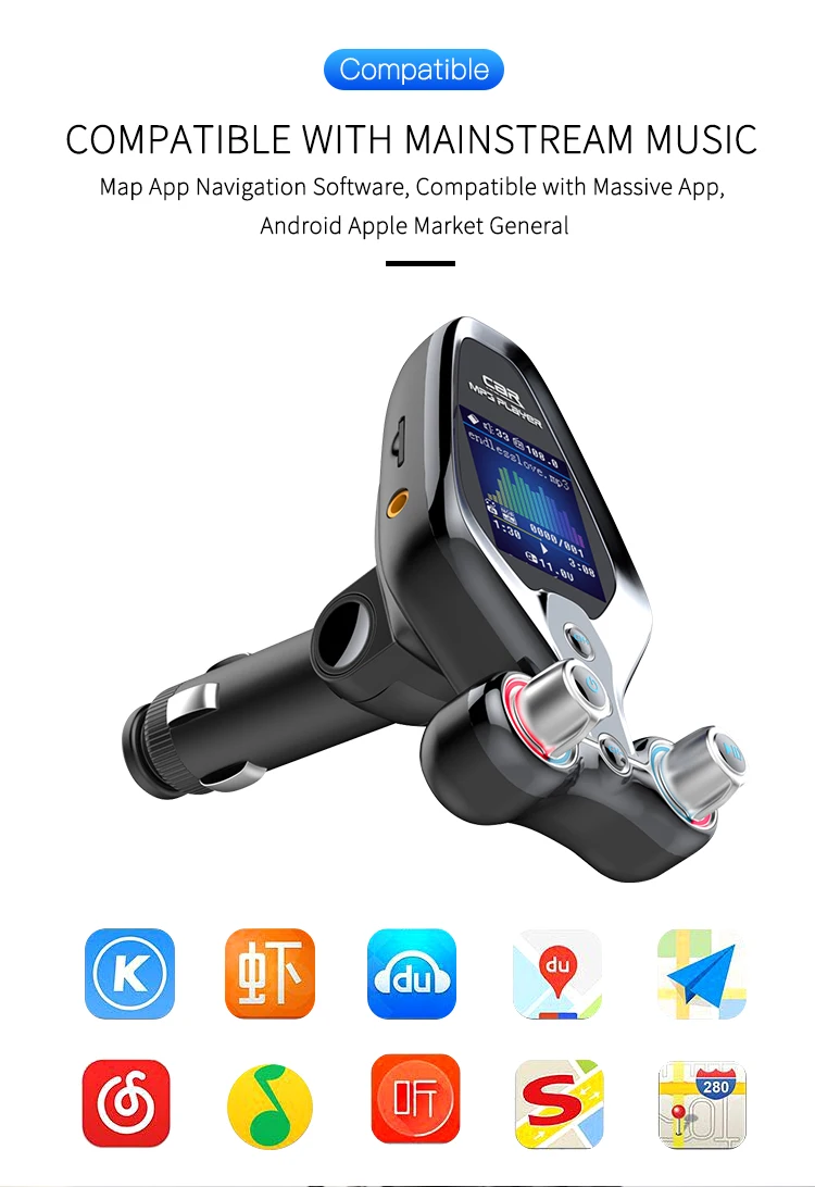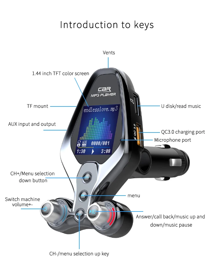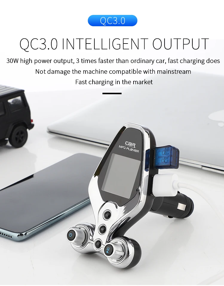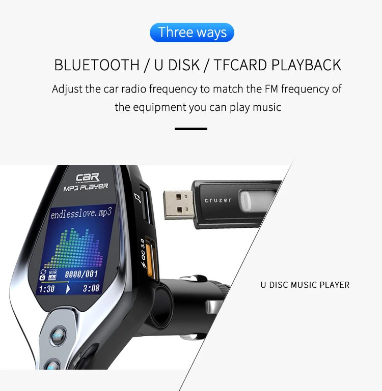 Specification: 1. BT V5.0, support hands-free call, BTmusic transmission, caller number 2. Support TF Card / U disc player and card reader function, support MP3/WMA format music 3. QC 3.0 quick charging can be used to charge external portable devices, suitable for all mobile phones, tablets and other electronic products 4. 1.43-inch TFT true color screen, display frequency, playing mode, EQ sound mode, reading data, music name and display voltage 5. Support one key menu setting language, playback mode, and sound mode 6. Support power failure memory and folder playback 7. AUX input and output function, open display voltage 8. One-key switch machine, pause, answer, up and down key function 9. FM emission frequency 87.5-108.1MHZ Package: 1pc * Bluetooth FM 1pc * Use Manual(No retial package)