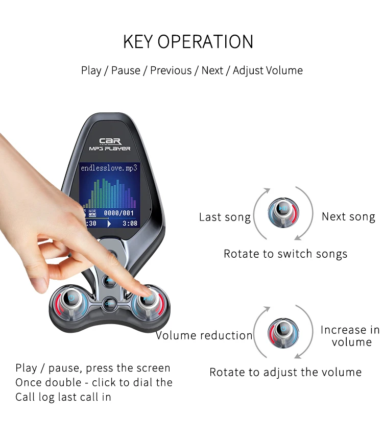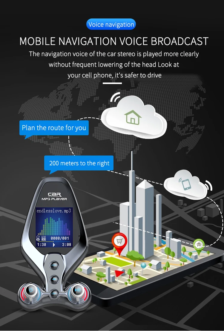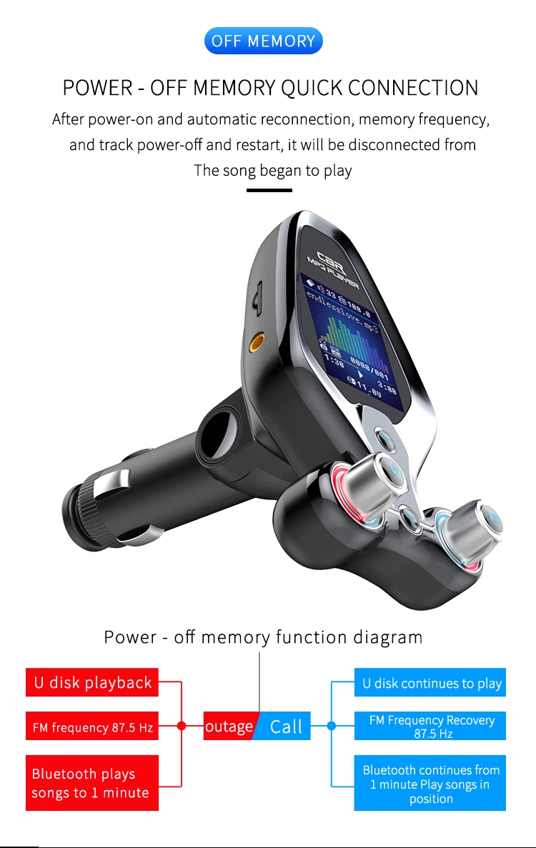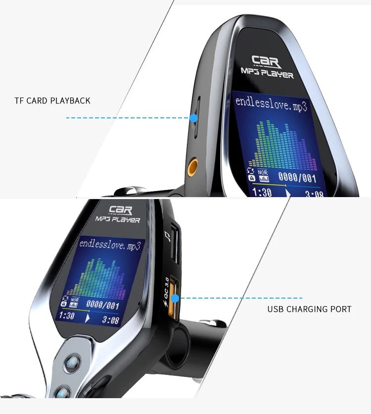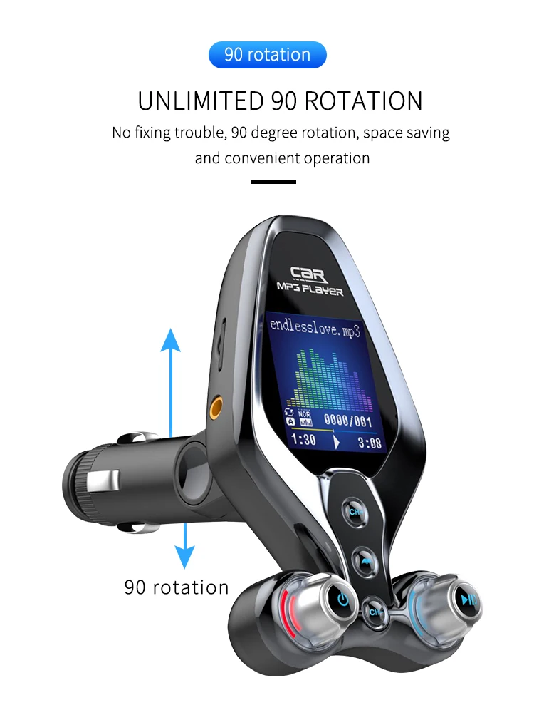 Specification: 1. BT V5.0, support hands-free call, BTmusic transmission, caller number 2. Support TF Card / U disc player and card reader function, support MP3/WMA format music 3. QC 3.0 quick charging can be used to charge external portable devices, suitable for all mobile phones, tablets and other electronic products 4. 1.43-inch TFT true color screen, display frequency, playing mode, EQ sound mode, reading data, music name and display voltage 5. Support one key menu setting language, playback mode, and sound mode 6. Support power failure memory and folder playback 7. AUX input and output function, open display voltage 8. One-key switch machine, pause, answer, up and down key function 9. FM emission frequency 87.5-108.1MHZ Package: 1pc * Bluetooth FM 1pc * Use Manual(No retial package)