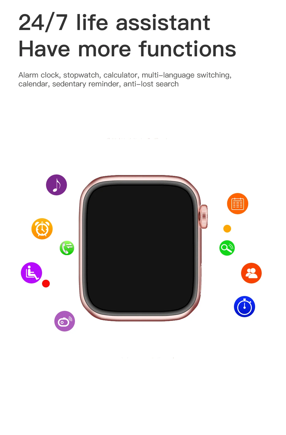 Other functions: flip the wrist to light up the screen, customize brightness, mute mode, anti loss, shake a shake to take photos, music control, stopwatch, alarm clock, calendar, calculator