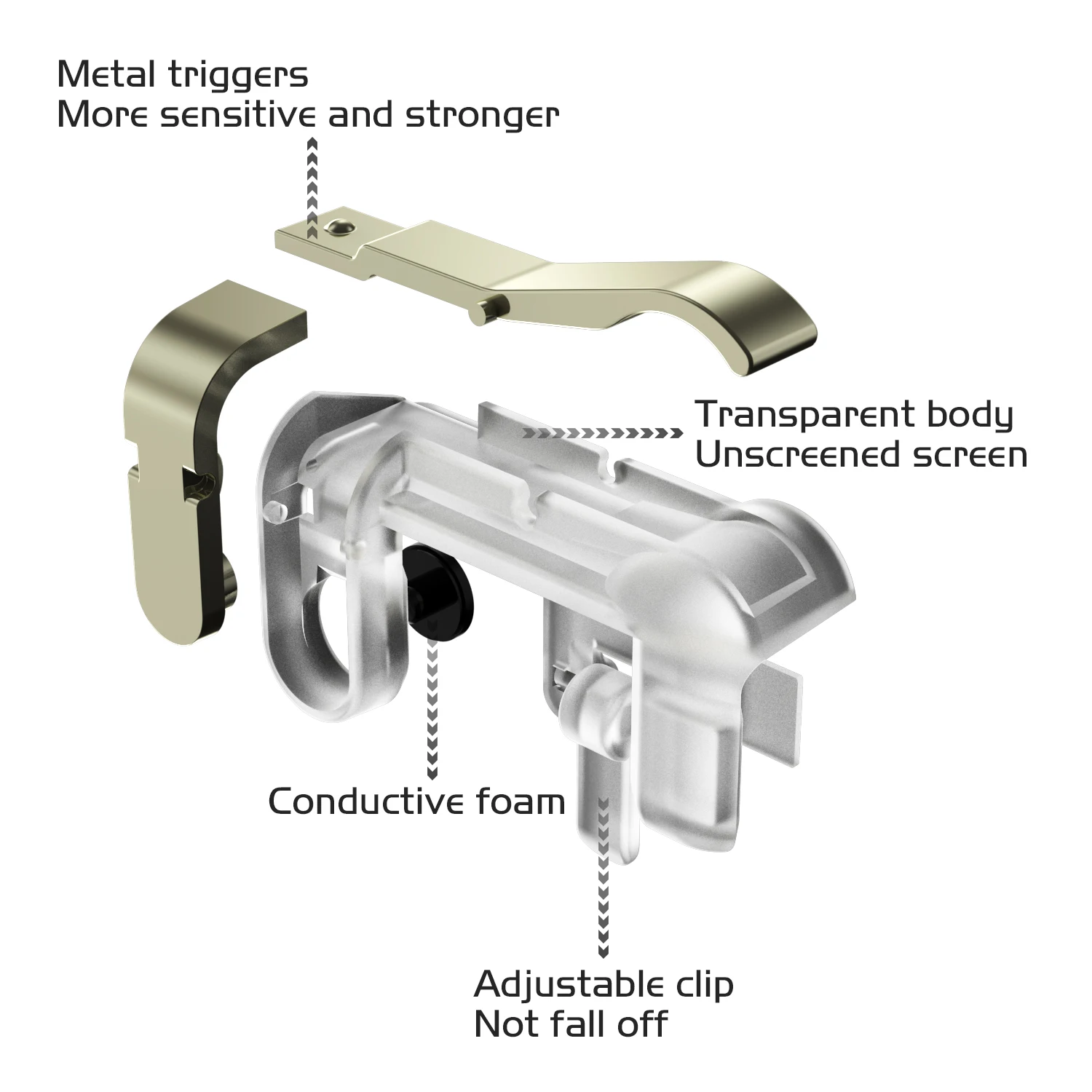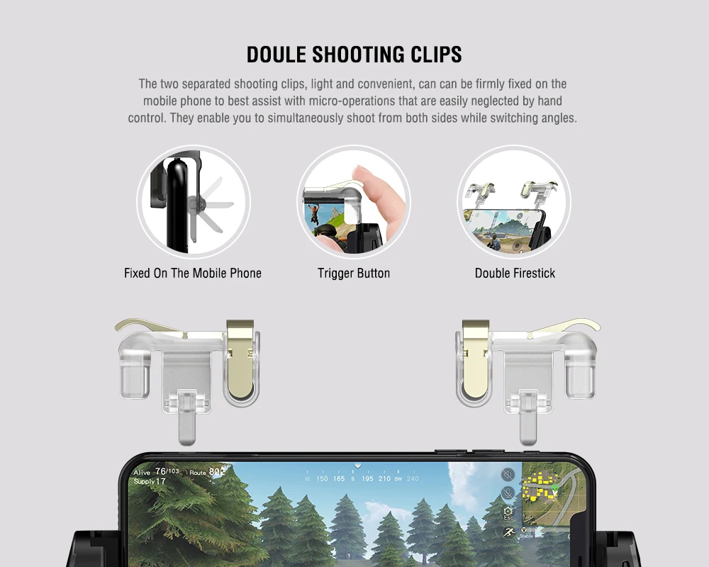 Speed is the key to getting chicken dinner in FPS games. Two separate clips can best assist in micromanipulation, which can easily be ignored by manual control. With GameSir F2 Firestick Grip, you can shoot from both sides while switching angles. The transparent design of the clip avoids covering the screen, and the high-density conductive rubber and alloy buttons ensure a quick and sensitive response.