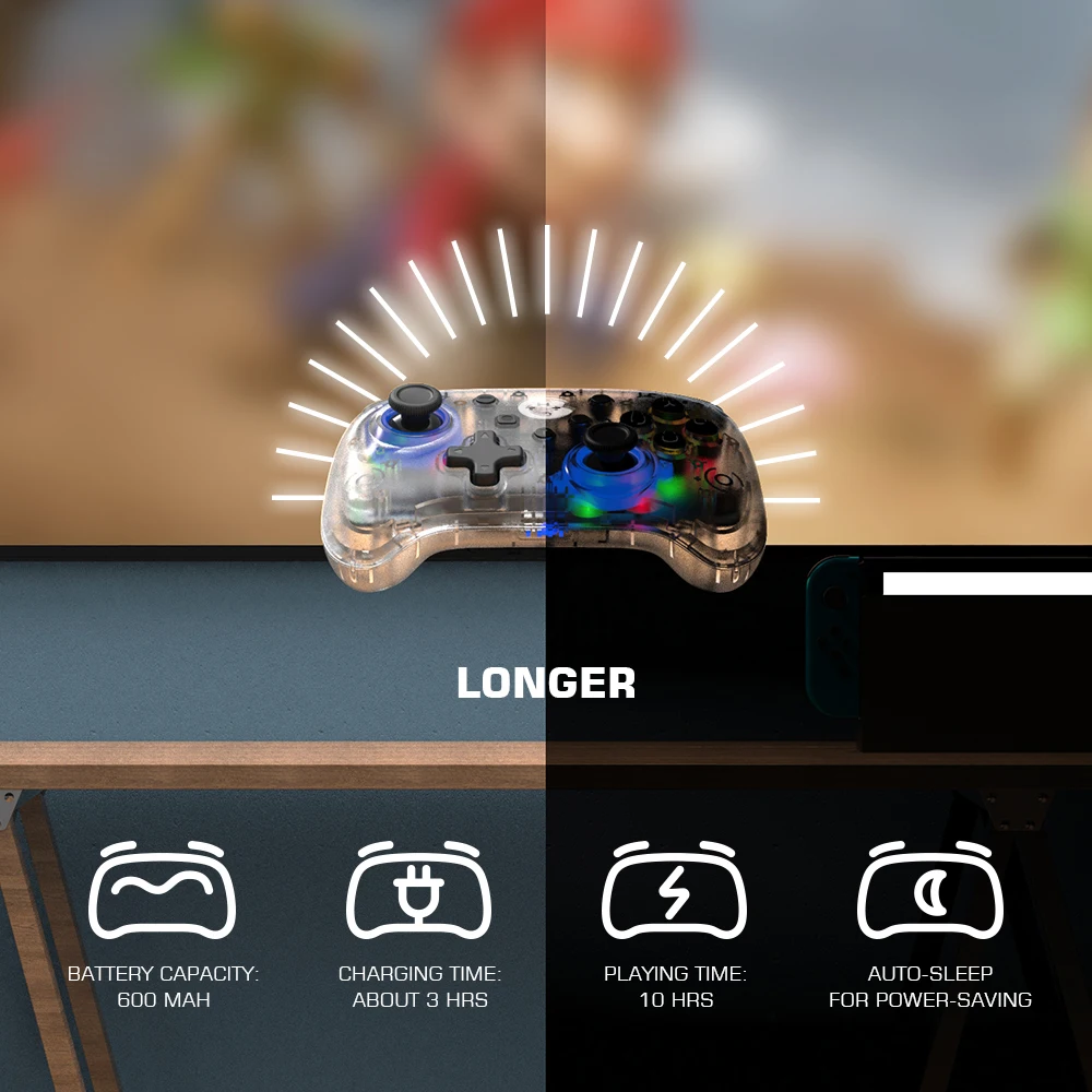 T4 Mini will go to auto-sleep mode after Switch console screen off, thus preserving battery life at more ease without a manual trigger. Meanwhile, one key to wake up Switch console makes you pick up Switch anytime in a hassle-free way, even if you just want a quick-to-start round for a refresh after a long workday or something else.