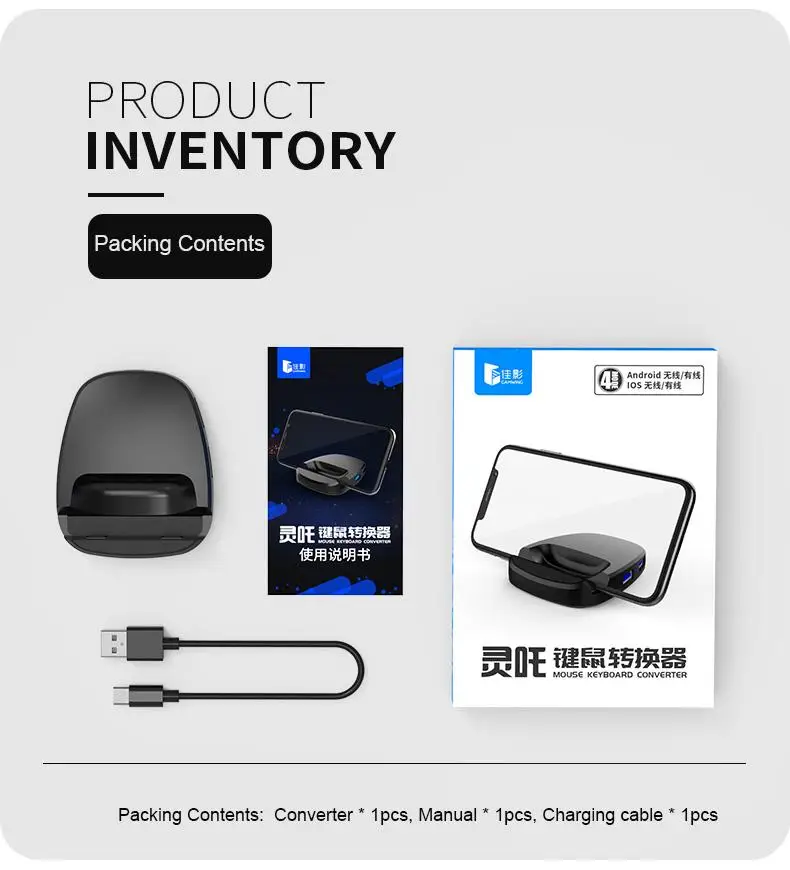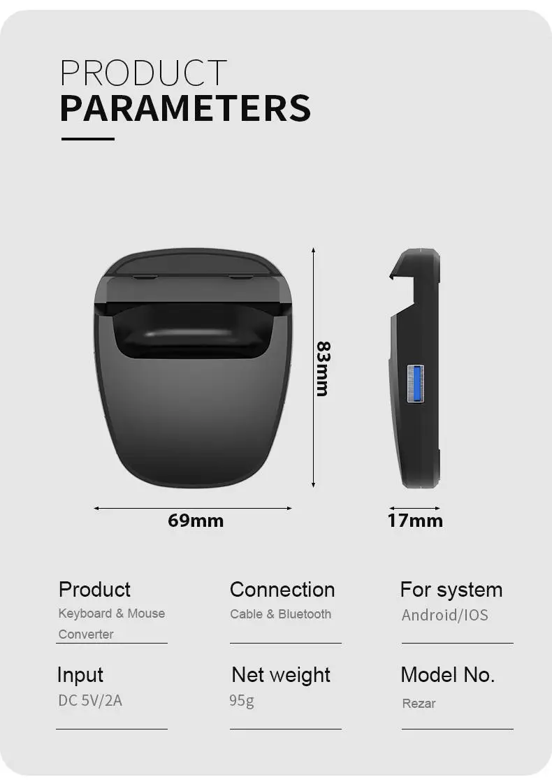 Features: 1.This is 4 mode connection Mobile Gaming Keyboard Mouse Converter compatible cooler fan 2.Compatible cooler fan,when playing PUBG,it can also help the phone cool down,giving you a better gaming experience 3.Play and play,No delay,no carton 4.Support four mode connect,Bluetooth/Wired connect to Andriod(Android6.0 and above),Bluetooth/Wired connect to IOS(IOS10 and above) 5.Match Mobile Phone Players,Do not modify official data, will not be banned 6.Charging while Play PUBG 7.Support Customizable settings