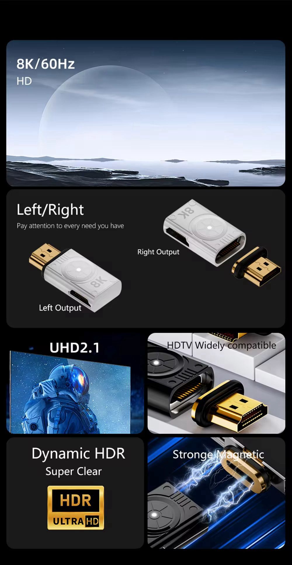 2.Ultra HD 8K 60Hz: Supports 8K@60Hz video output with UHD 2.1 version, providing adaptive resolution. HDMI-Compatible magnetic connector is also backward compatible with 4K@120Hz and 4K@60Hz. Experience a wider dynamic range and enhanced image details, delivering a more immersive and realistic viewing experience. Note: Both the host and display devices must be 2.1 version compatible to meet the requirements.