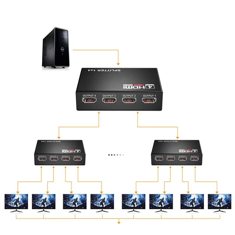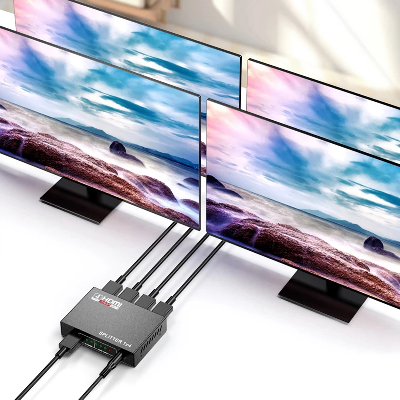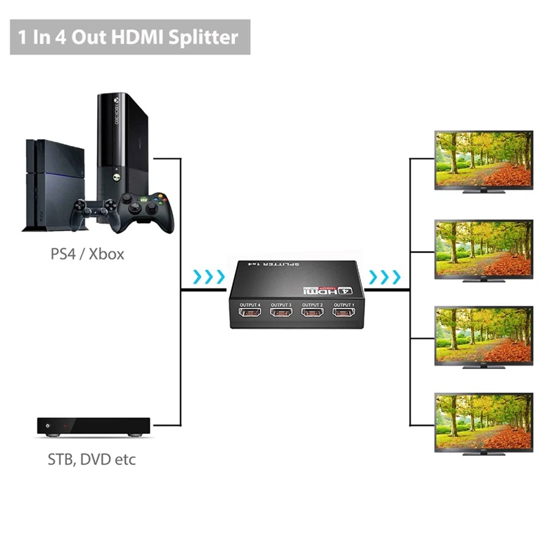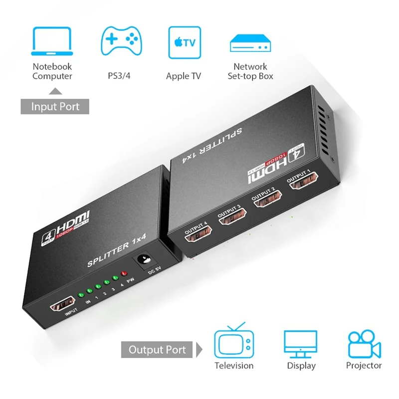 Advantages of HDMI Splitter:The HDMI splitter allows you to distribute HDMI signals from a set-top box, DVD players, d-vhs players and other HD TV devices to a 4-channel synchronous synchronous HDMI signal output.