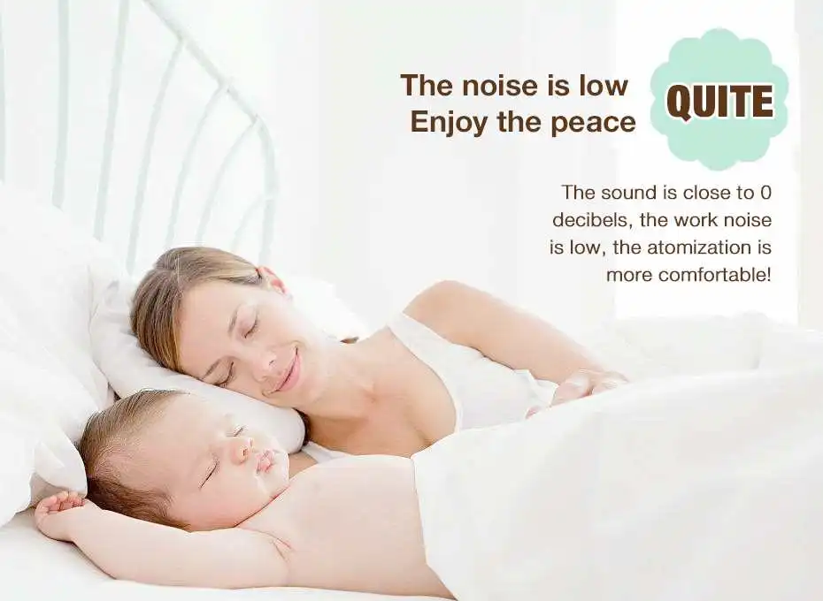 Quiet atomizer: less than 50 decibel(can reach 0 decibel); almost no noise; suitable for using while sleeping for kids.
