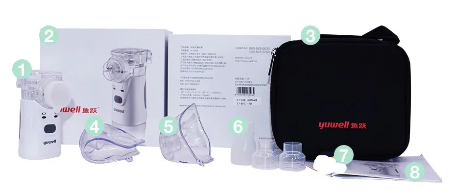 1 Nebulizer; 1 Large mask for adults; 1 Small mask for kids; 1 mouthpiece; 1 Carry bag; (without battery)