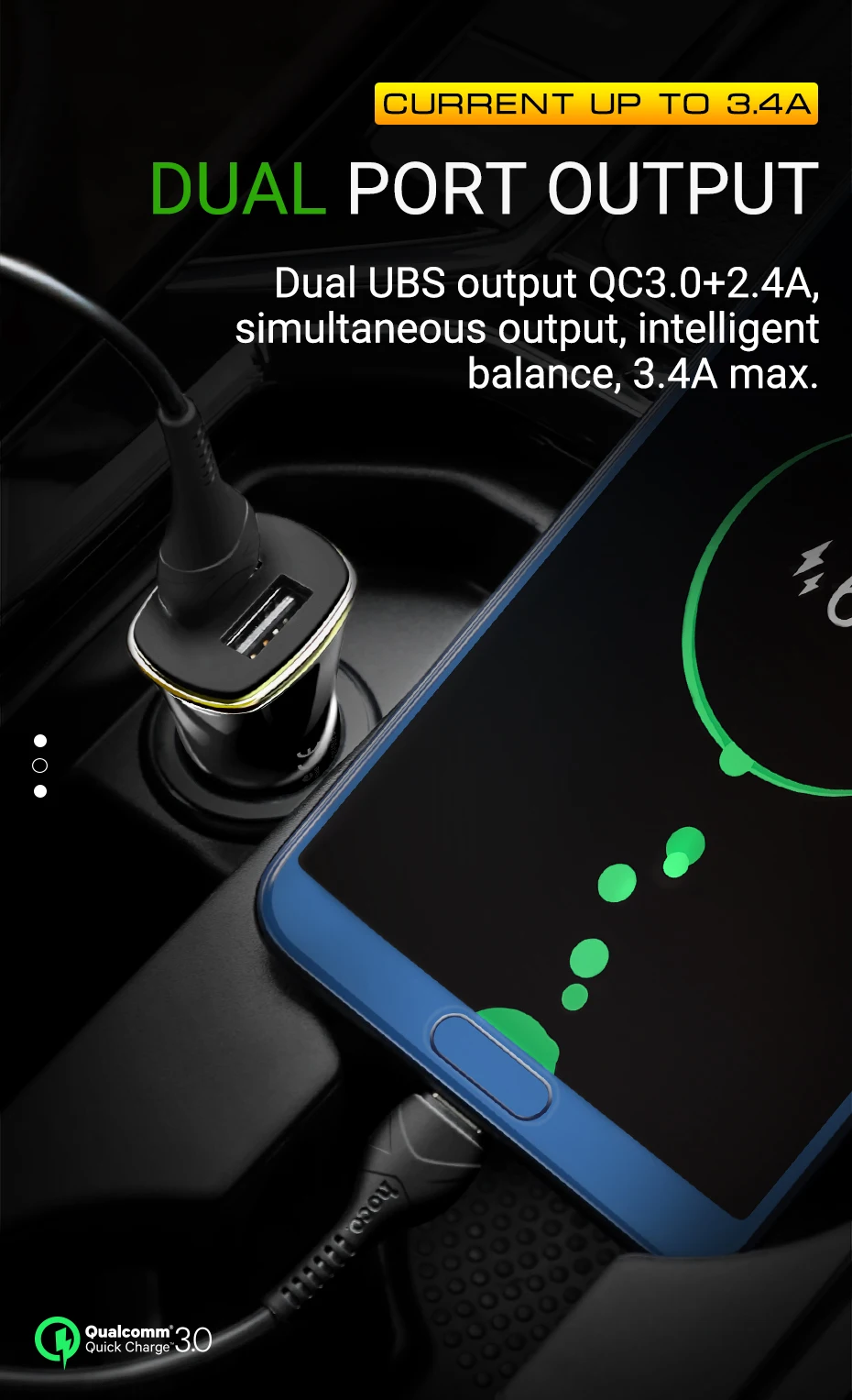 Salida USB doble QC3.0 + A, salida simultánea, equilibrio inteligente, A máx.