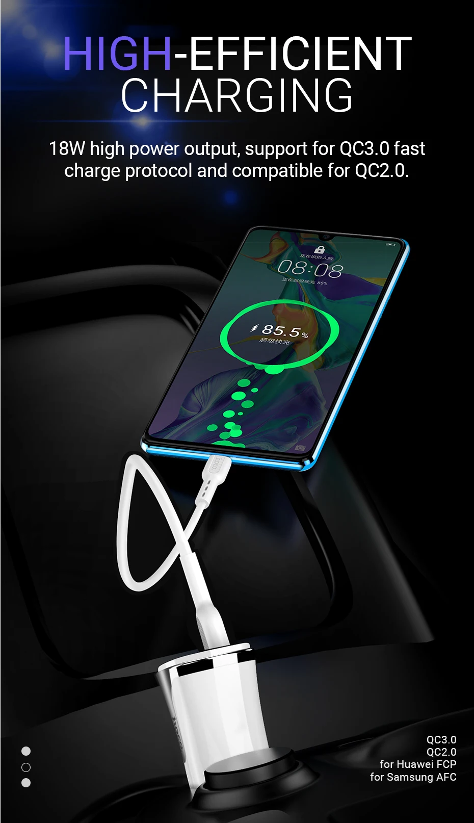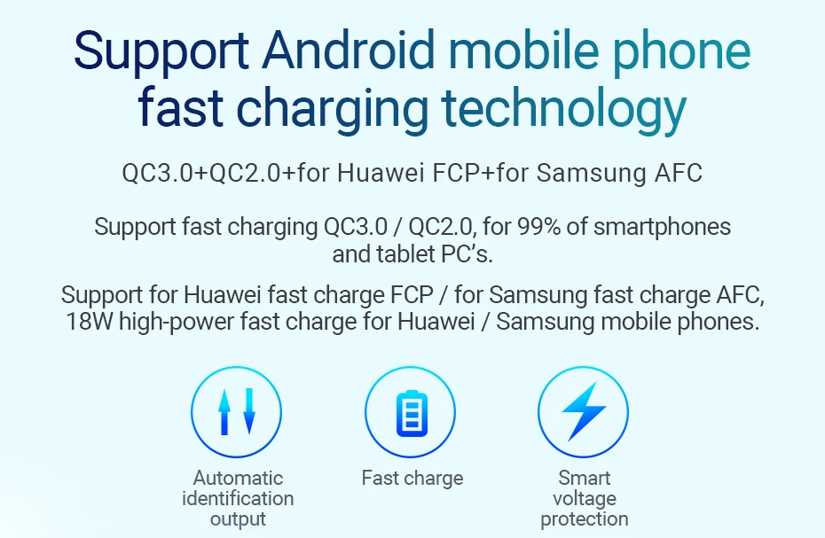Compatible con Huawei carga rápida FCP/Samsung carga rápida AFC, carga rápida de 18 W de alta potencia para teléfonos móviles Huawei/Samsung.