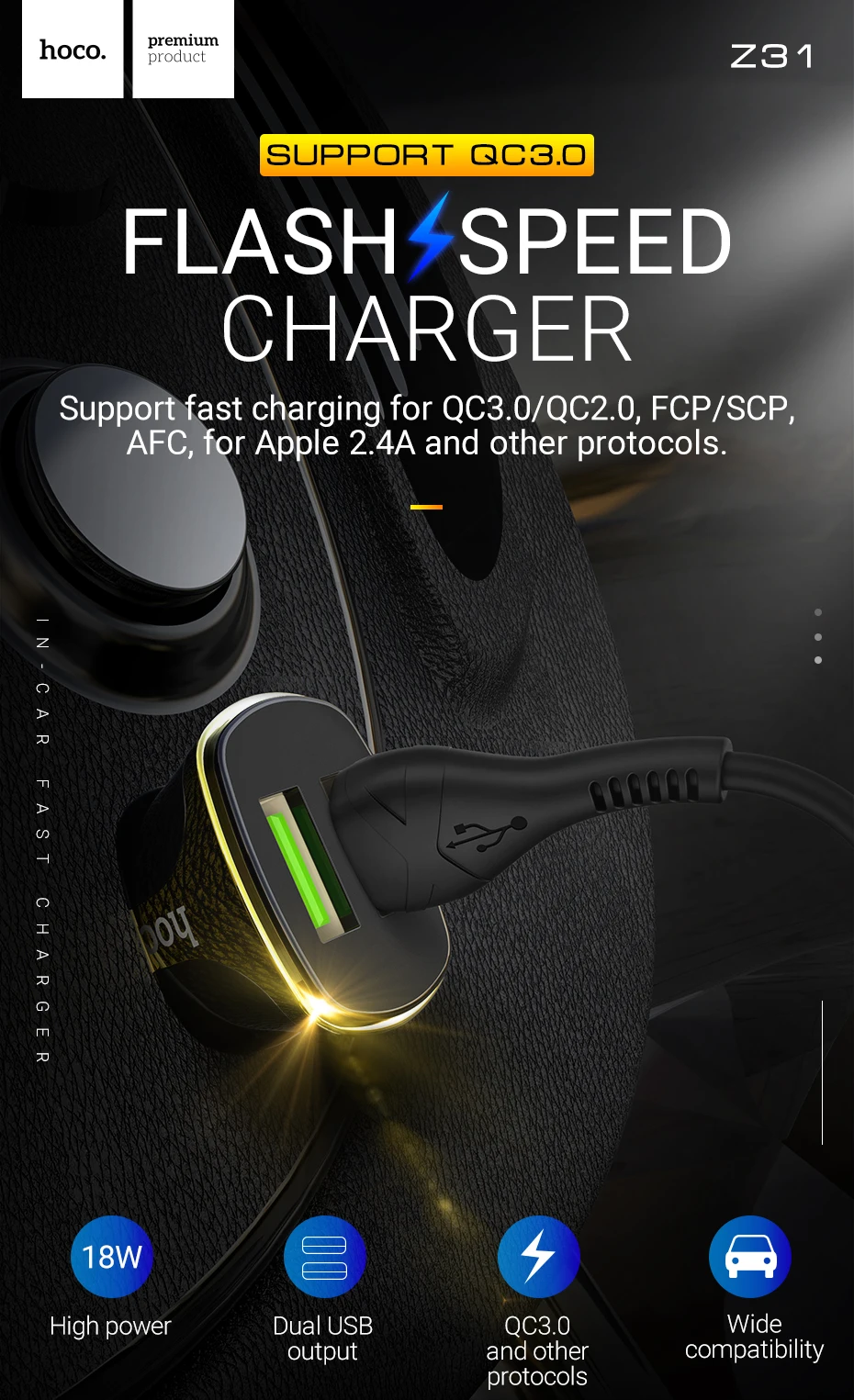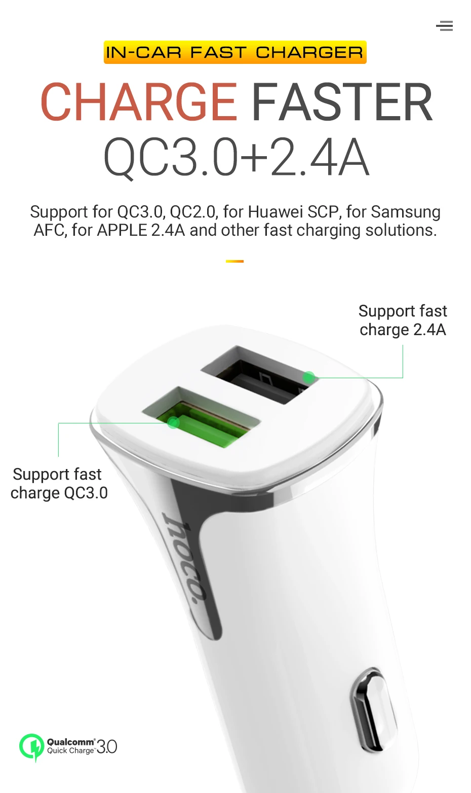 ¡Carga más rápido! QC3.0 + 2.4A. Admite carga rápida para QC3.0/QC2.0, FCP/SCP, AFC, para Apple y otros protocolos.