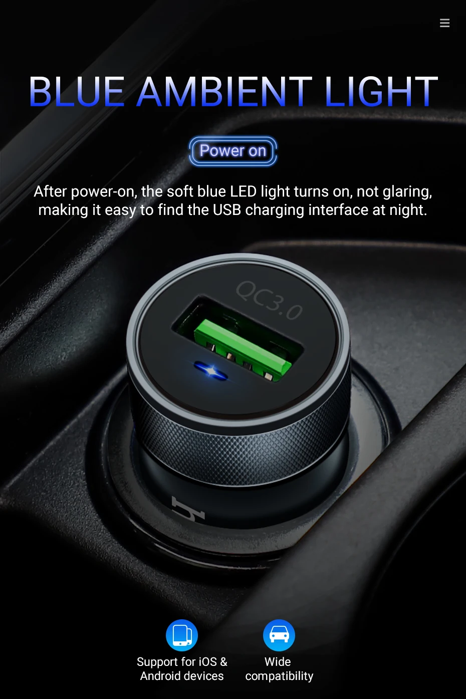 Después del encendido, la luz LED azul suave se enciende, no deslumbrante, haciendo que sea fácil encontrar la interfaz de carga USB de noche.