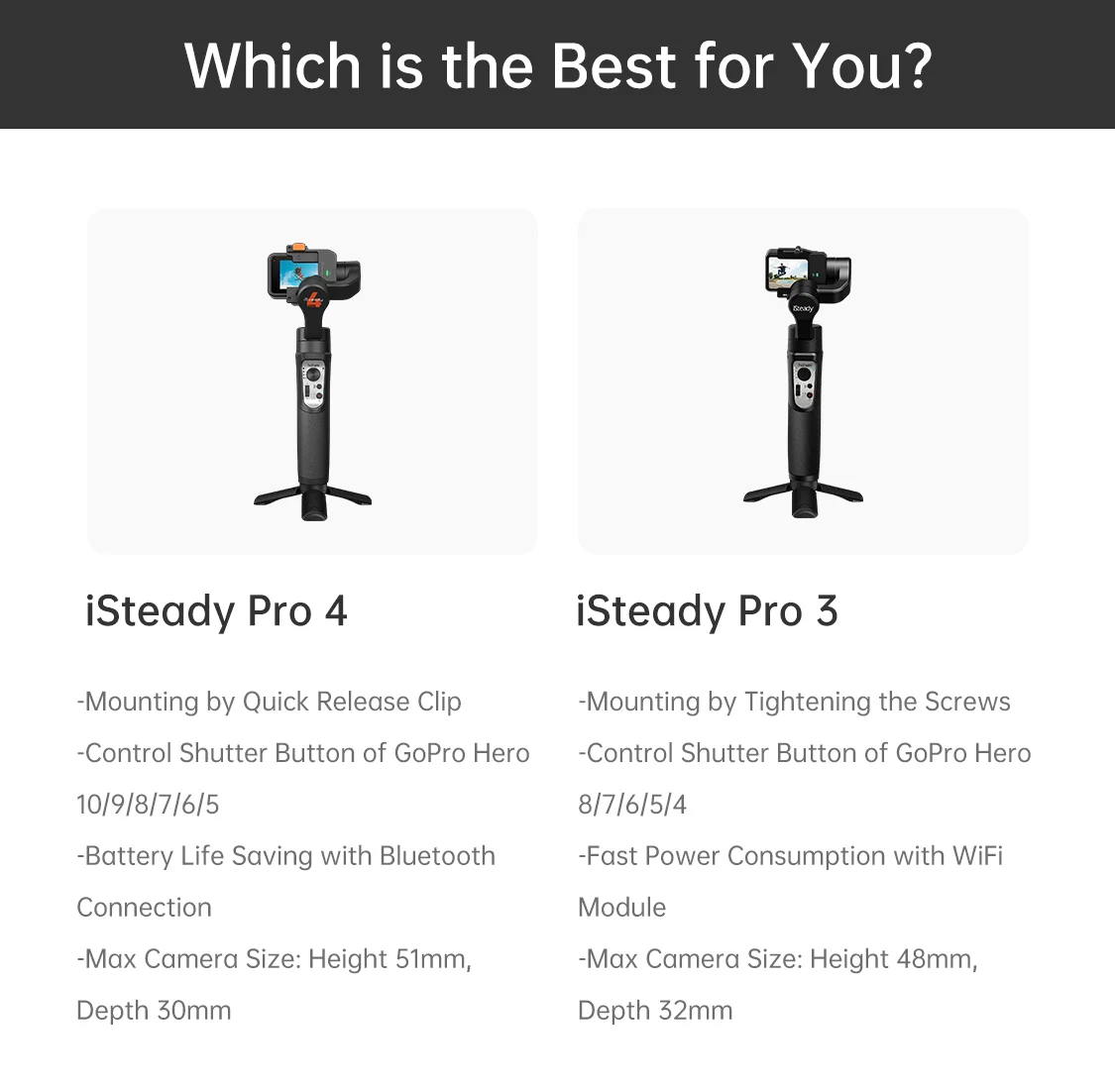 iSteady Pro 4 is compatible with GoPro Hero 10/9/8/7/6/5/4/3, DJI OSMO Action, Insta360 ONE R (4K & 1-Inch), and other action cameras with similar size.
