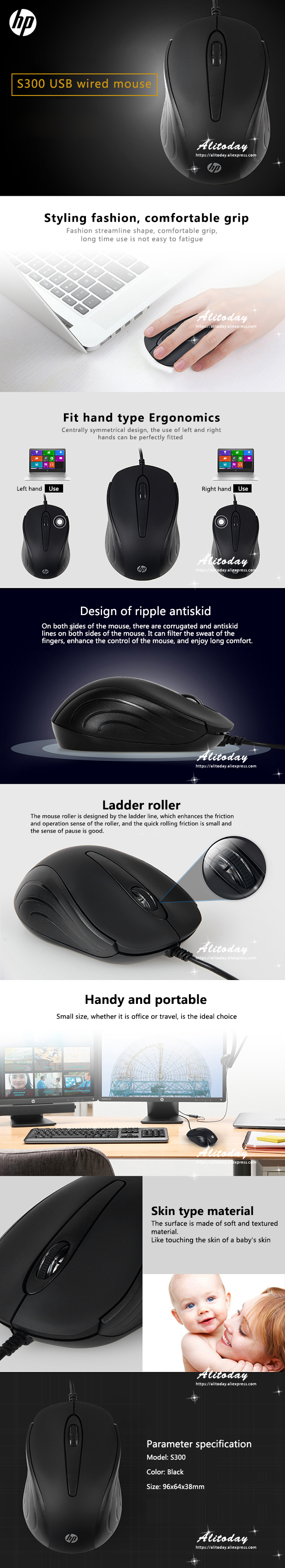 HP S300 Optical USB wired mouse 1000DPI 3-Button Laptop PC Office wired mouse
