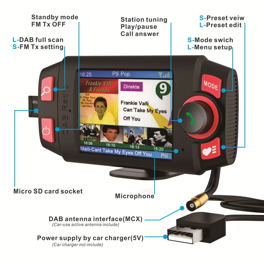 2.4’’ colorful display Car DAB+/DAB Radio Adapter FM Transmitter, with Bluetooth hands-free and Music Playback car kit MP3 player.