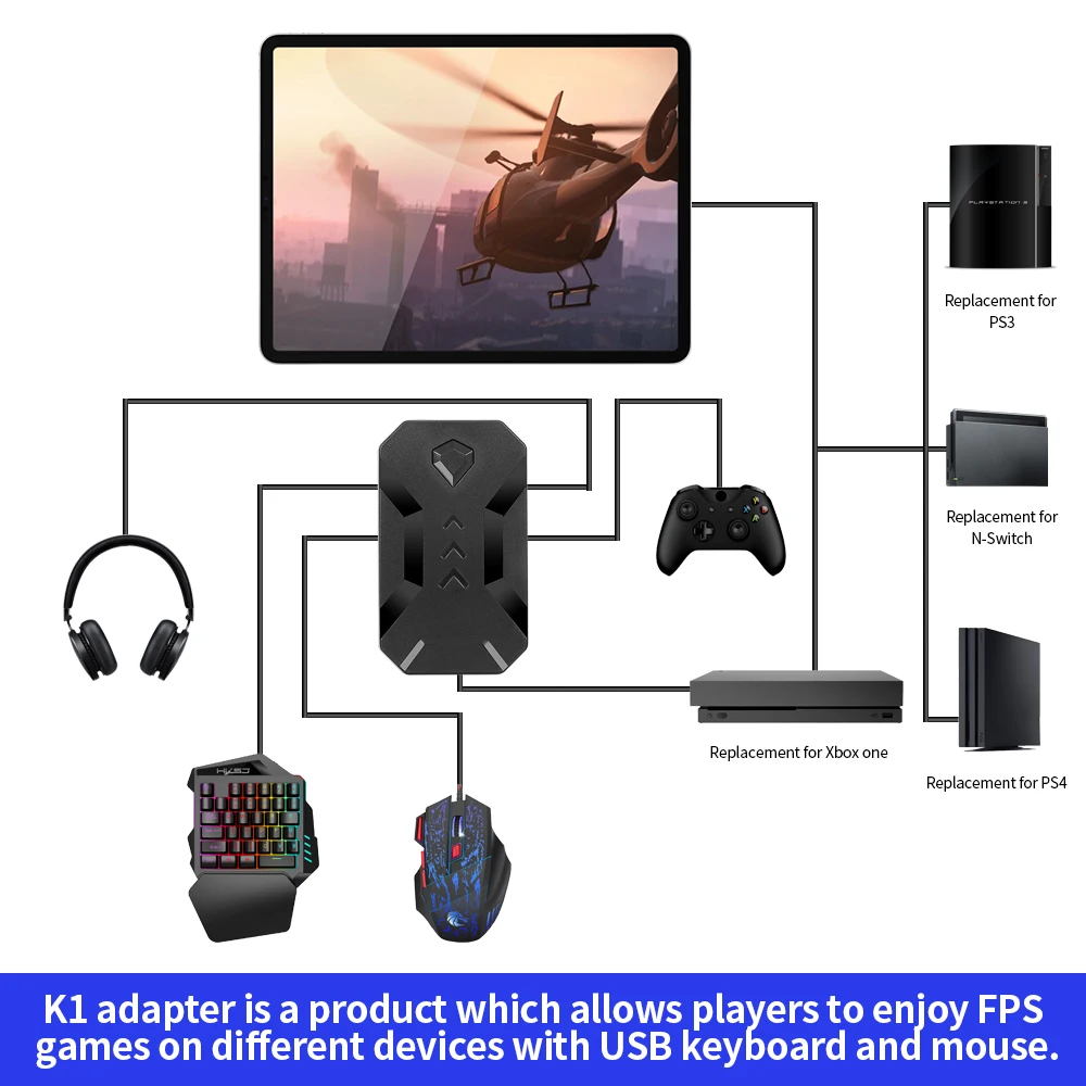 K1 adapter is replacement for Nin-tendo Switch, Xbox, PS4&PS3 console, and headphone can be used on Xboxone and PS4 console.