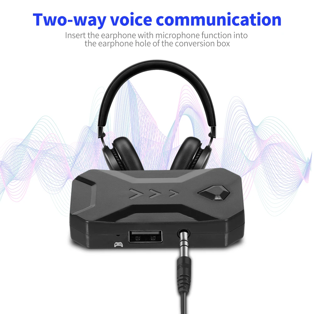 Insert the earphone with microphone function into the earphone hole of the conversion box to realize two-way voice communication in the game.