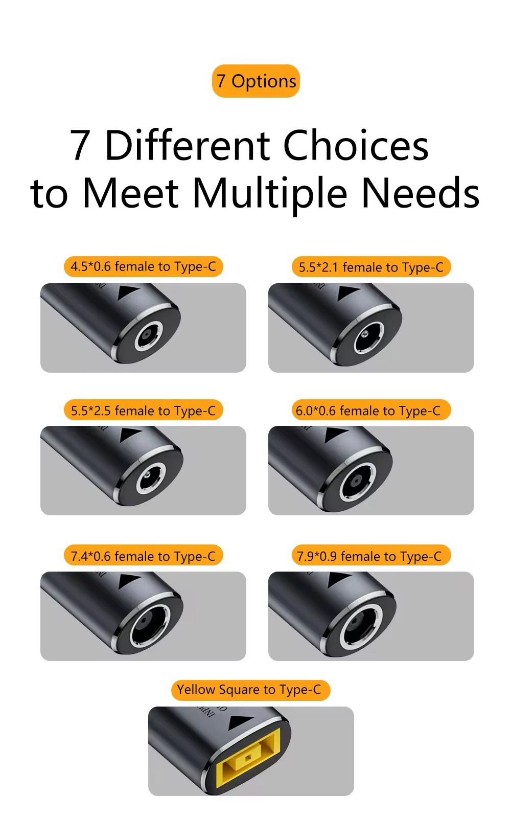 The adapter comes with a range of DC connector interfaces, including 4530, 7450, 5521, 5525, 6006, 7909 and Yellow Square Port for selection